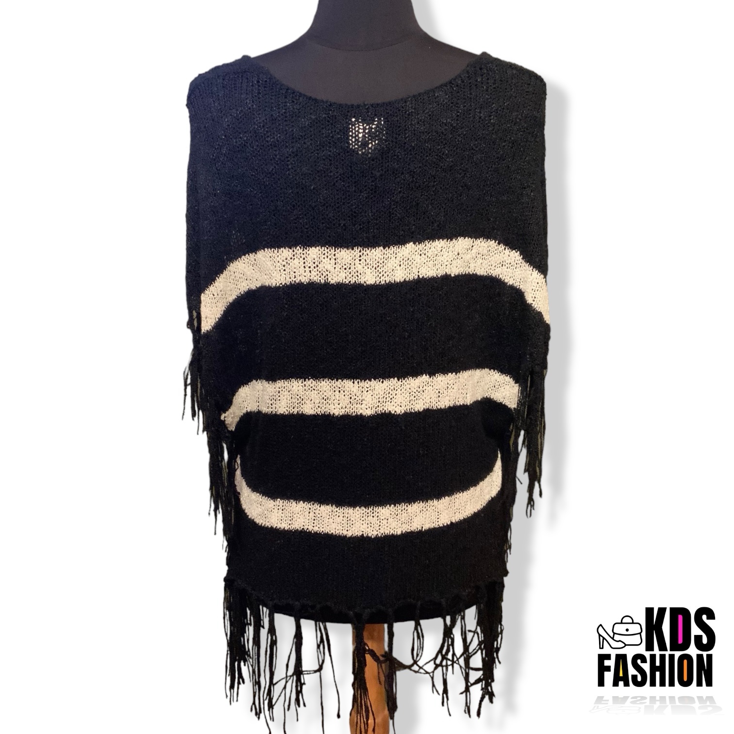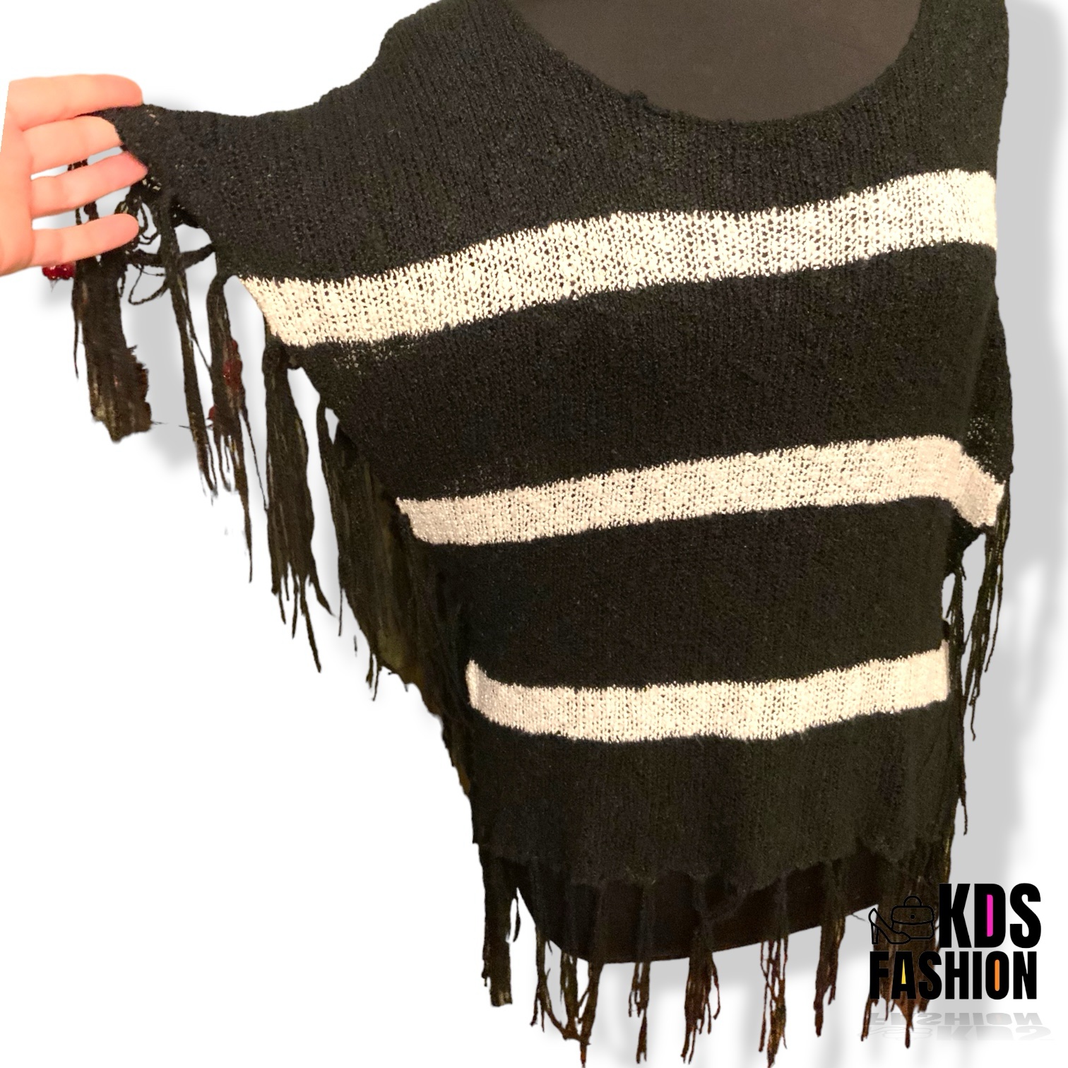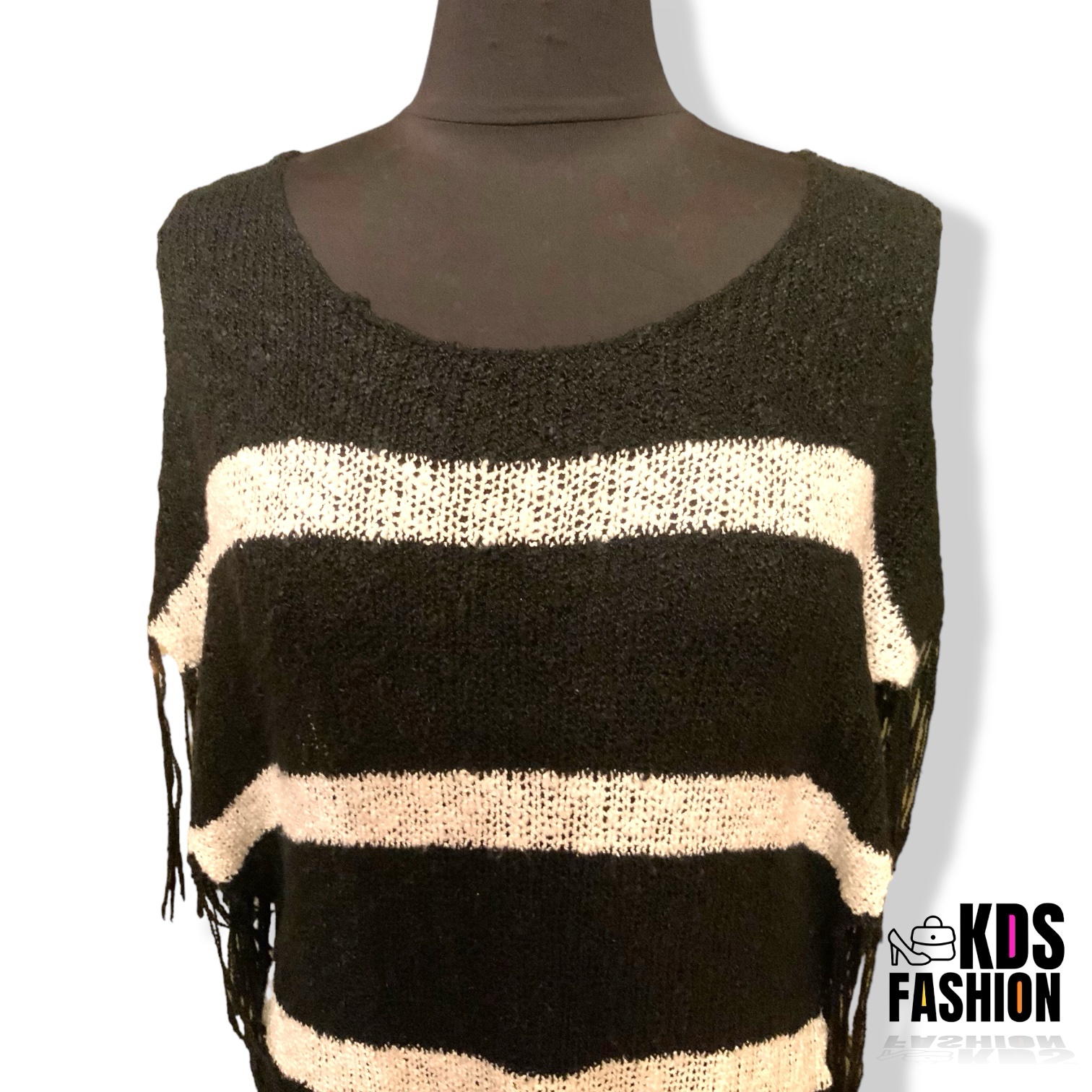 This lightweight sweater is in excellent condition, with fringe on the sleeves and bottom. The black and white striped design makes it perfect for casual wear, and it pairs well with a black tank or bralette. With a chest measurement of 23” and a length of 33” to the bottom of the fringe, this sweater is a stylish and comfortable addition to your wardrobe.