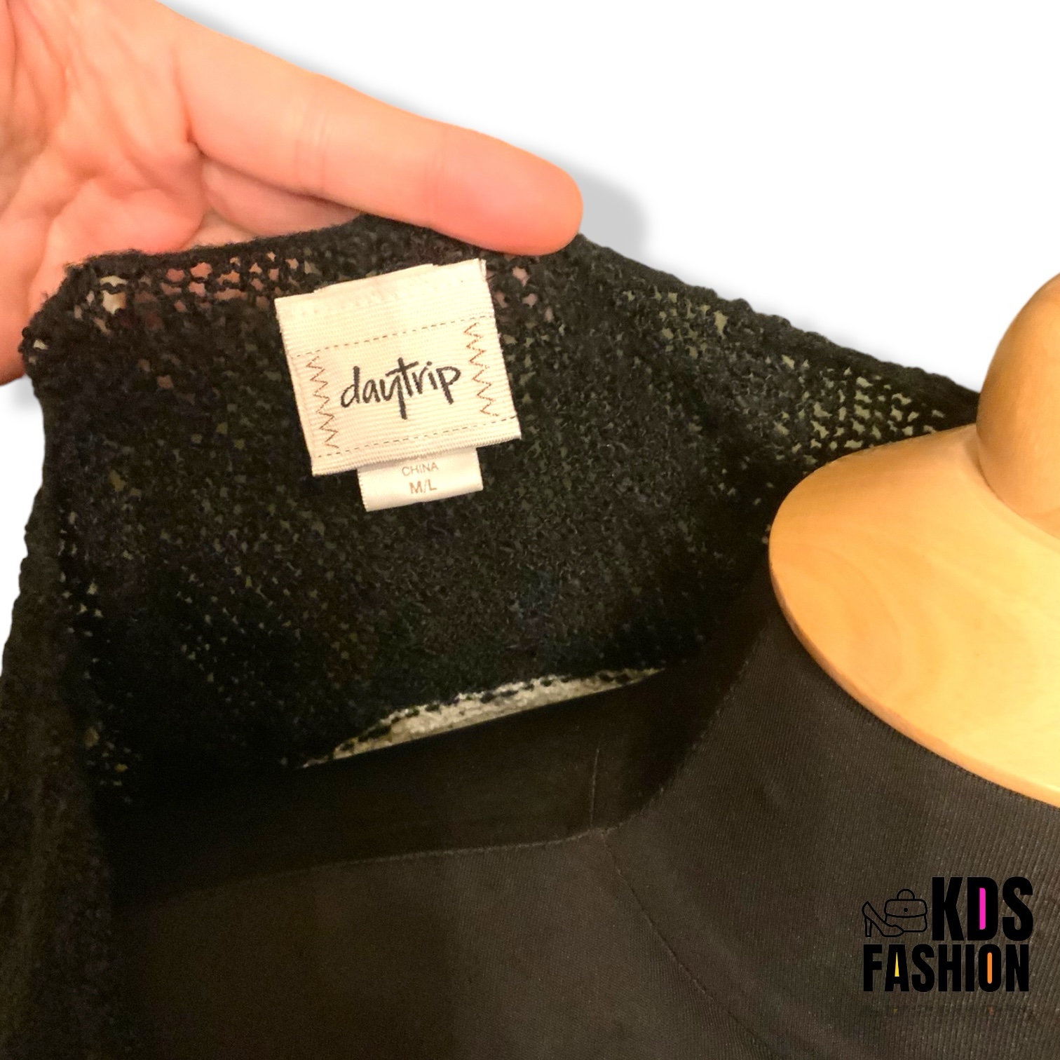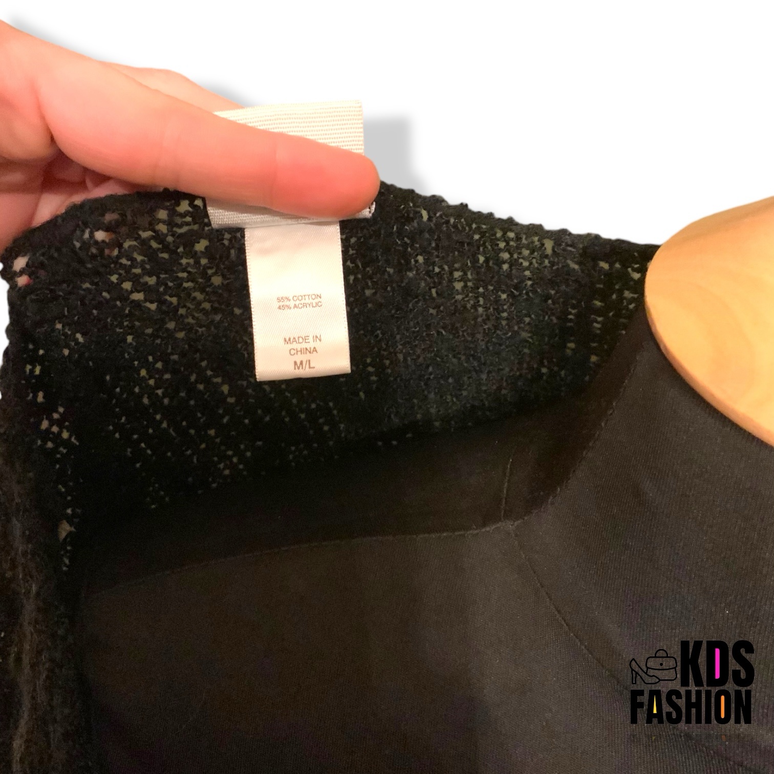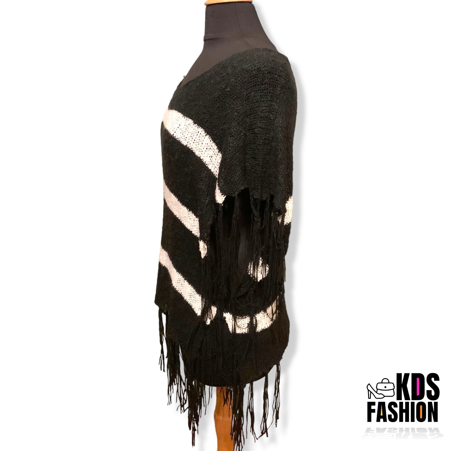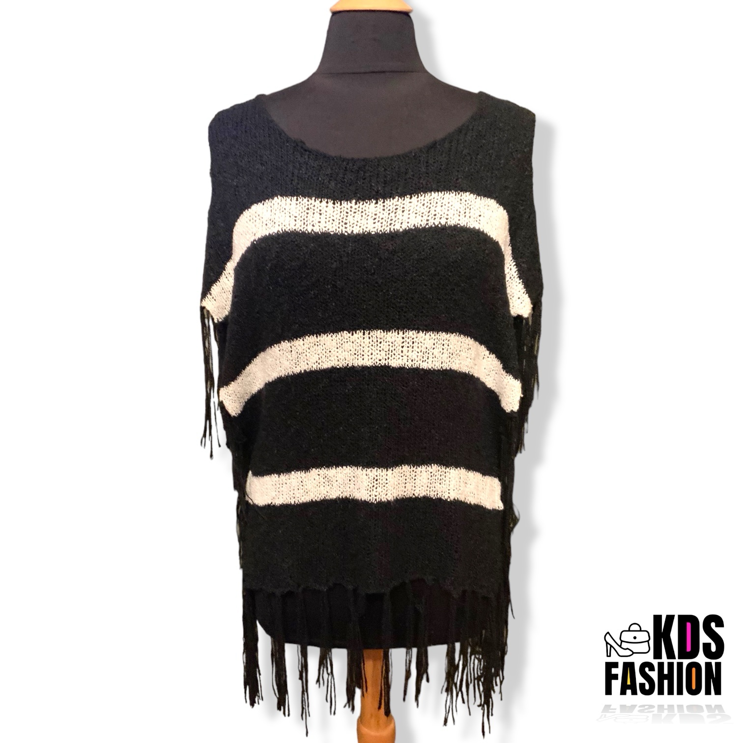 This lightweight sweater is in excellent condition, with fringe on the sleeves and bottom. The black and white striped design makes it perfect for casual wear, and it pairs well with a black tank or bralette. With a chest measurement of 23” and a length of 33” to the bottom of the fringe, this sweater is a stylish and comfortable addition to your wardrobe.