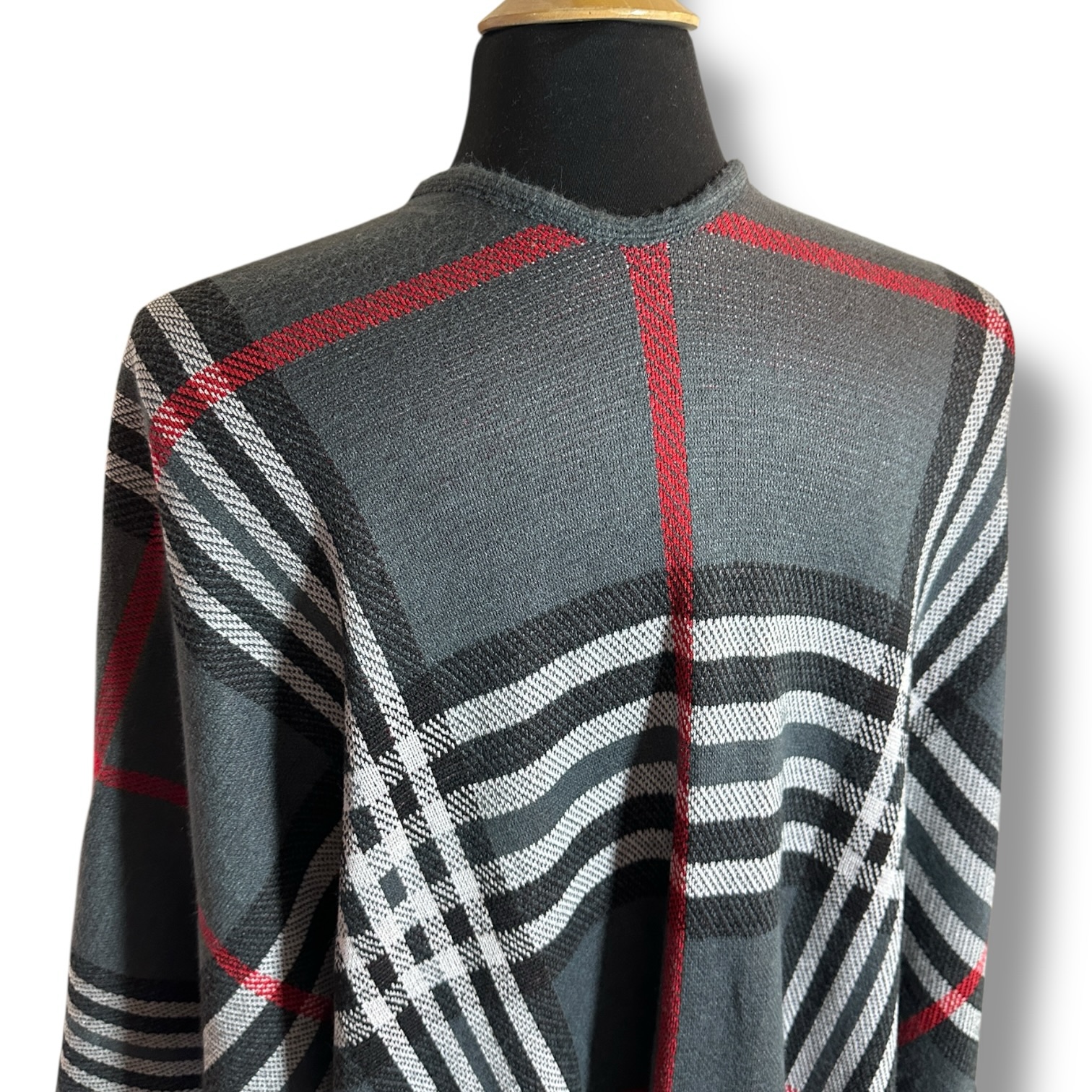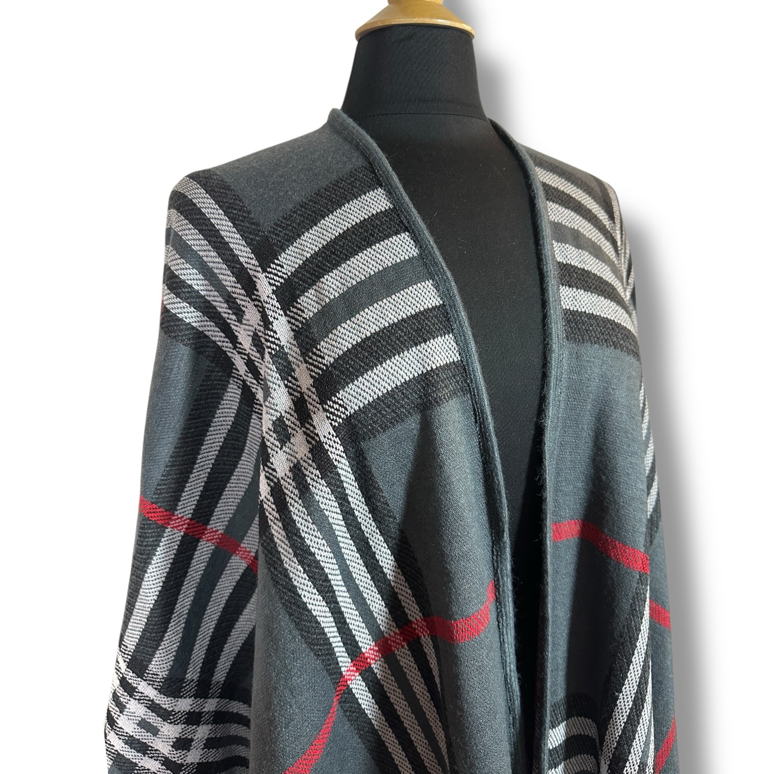 Stay cozy and stylish with this classic plaid ruana shawl in a versatile gray, black, white, and red color palette. The open-front design drapes beautifully and makes an effortless layering piece for fall and winter.