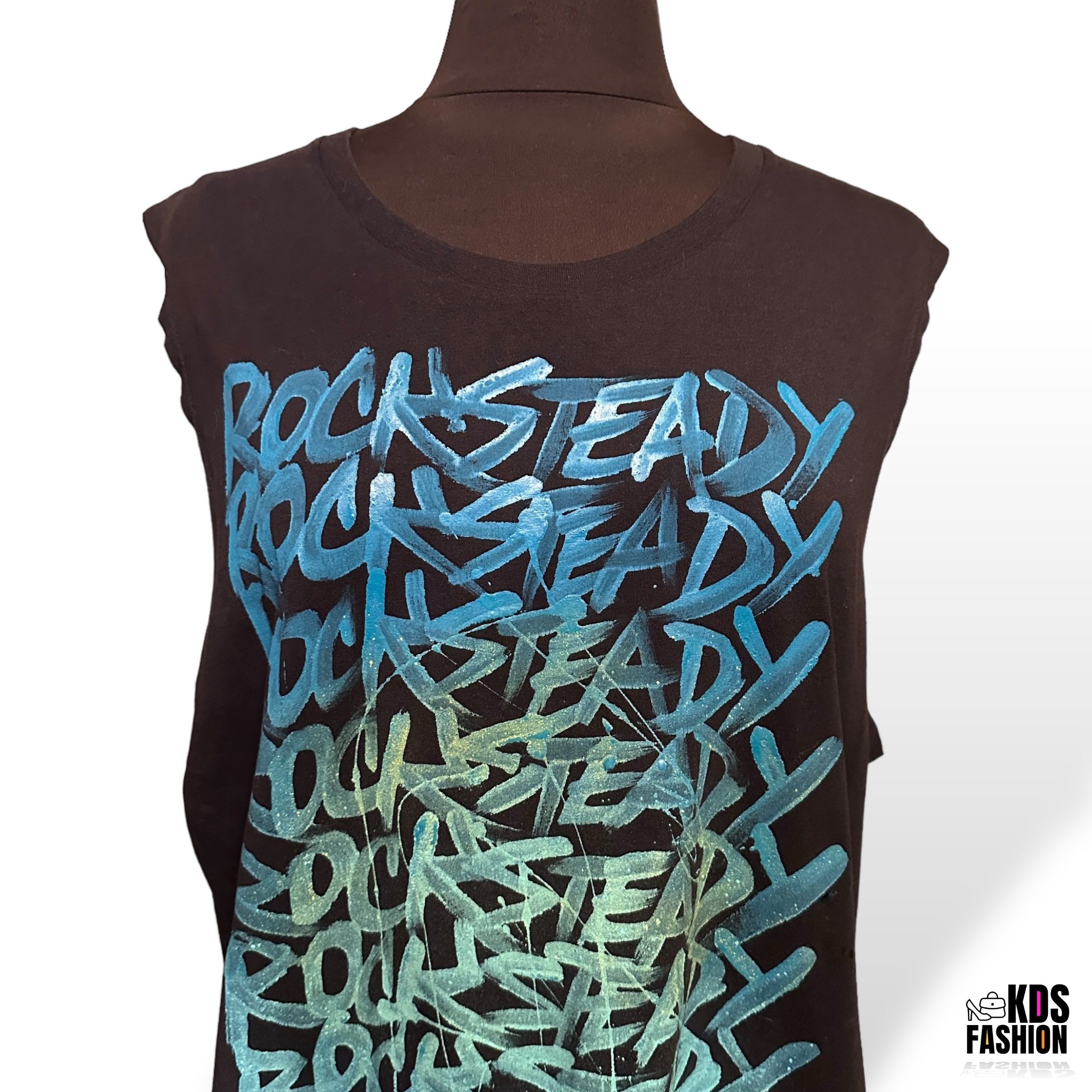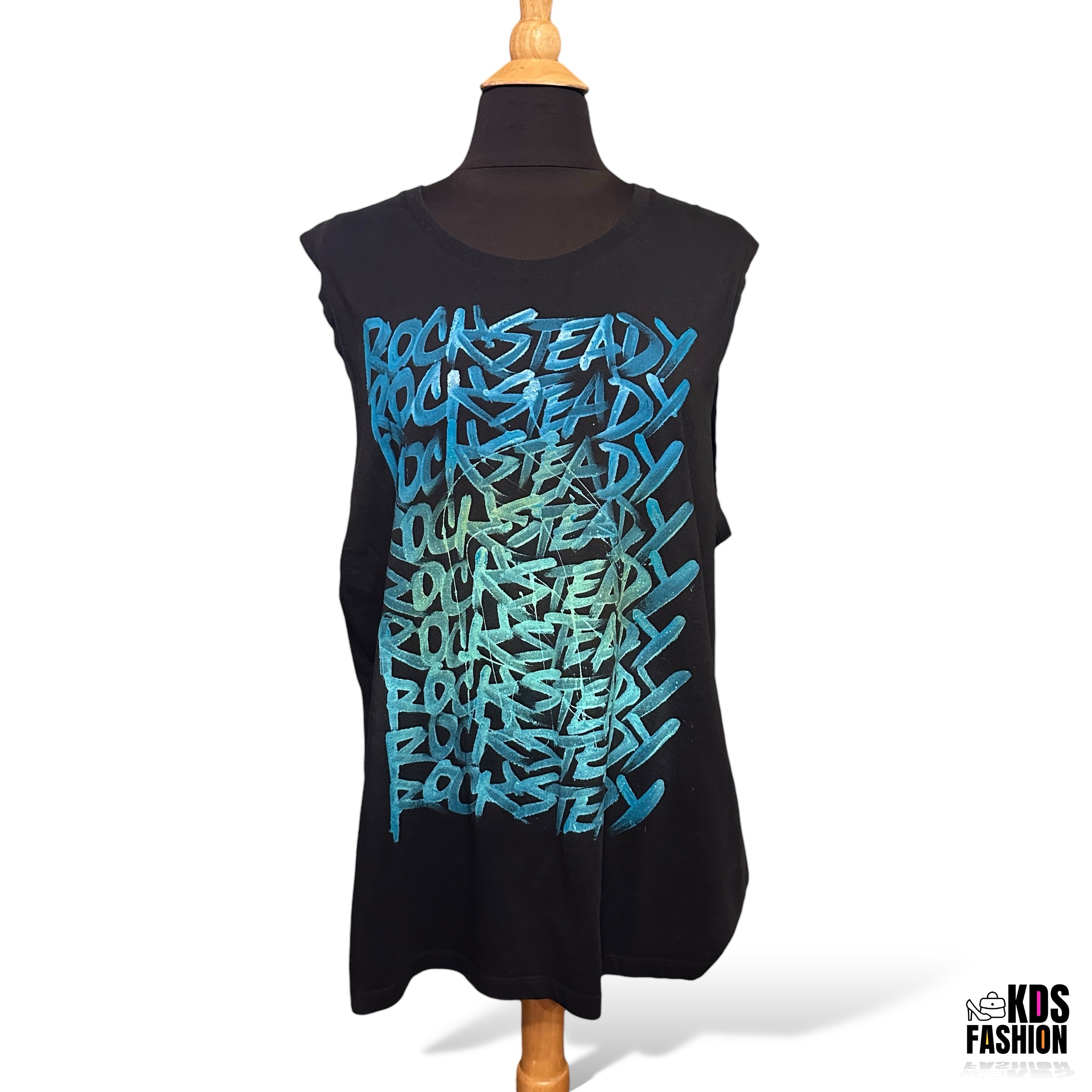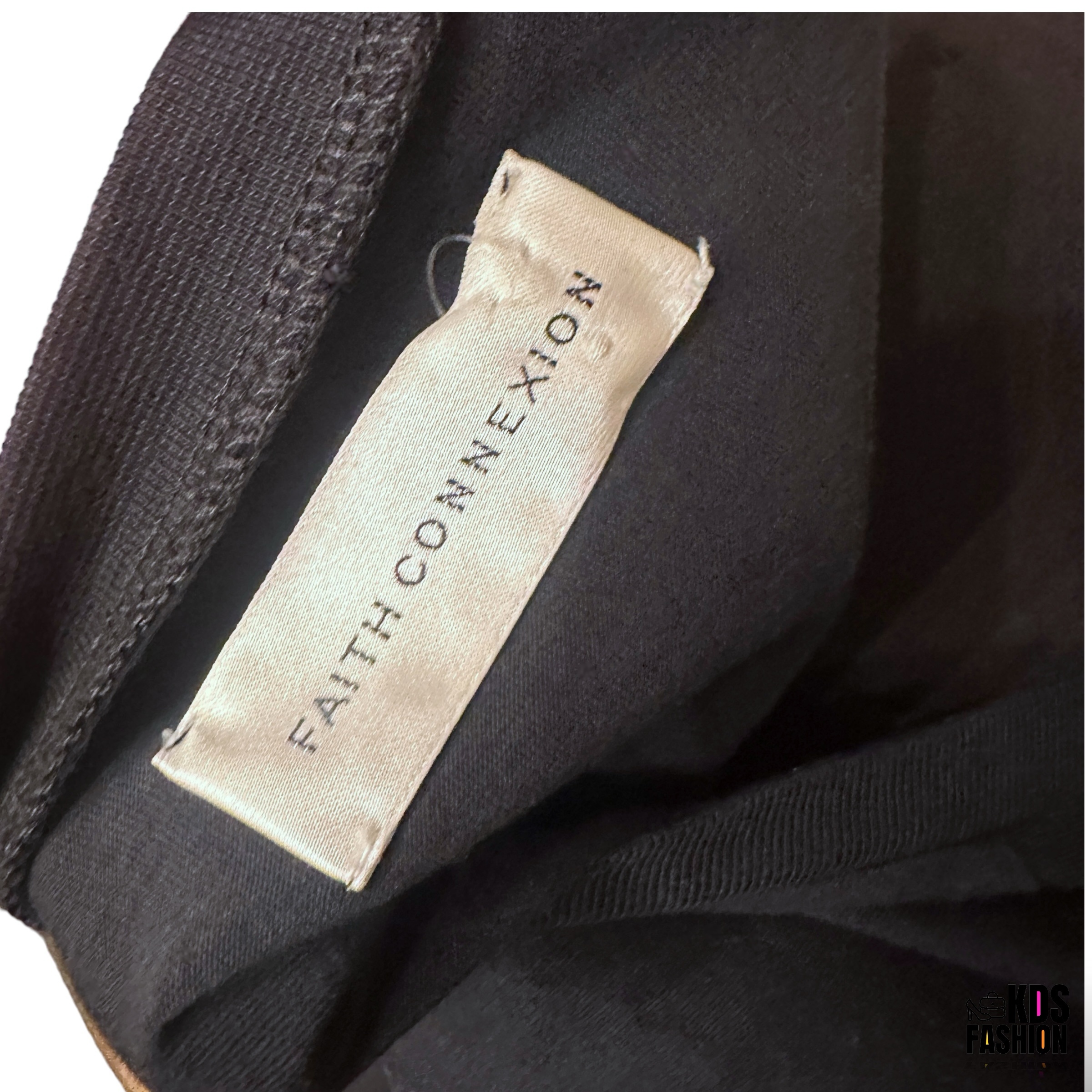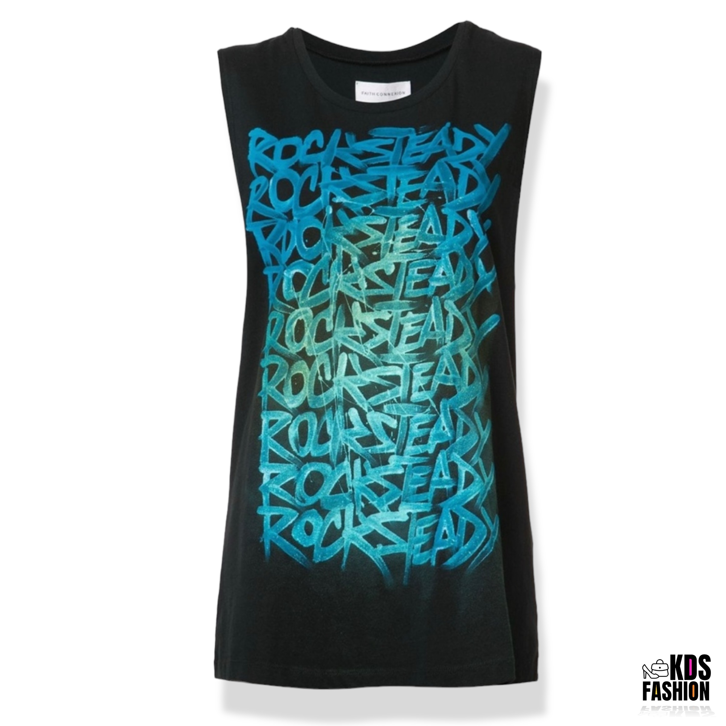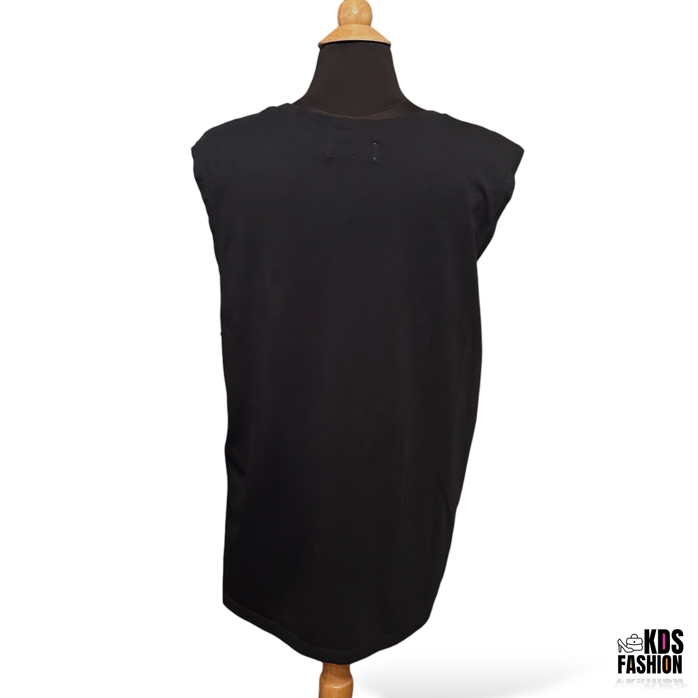 Elevate your casual wardrobe with this sleeveless designer tee by Faith Connexion. Made from 100% cotton, this high-end piece does have a small repair at the side, not noticeable. With a touch of punk style and a hint of sexiness, this black sleeveless tee is a must-have for those who want to make a statement. The unique design and graffiti design make it a standout addition to any wardrobe. 23″ chest and 30″ length.