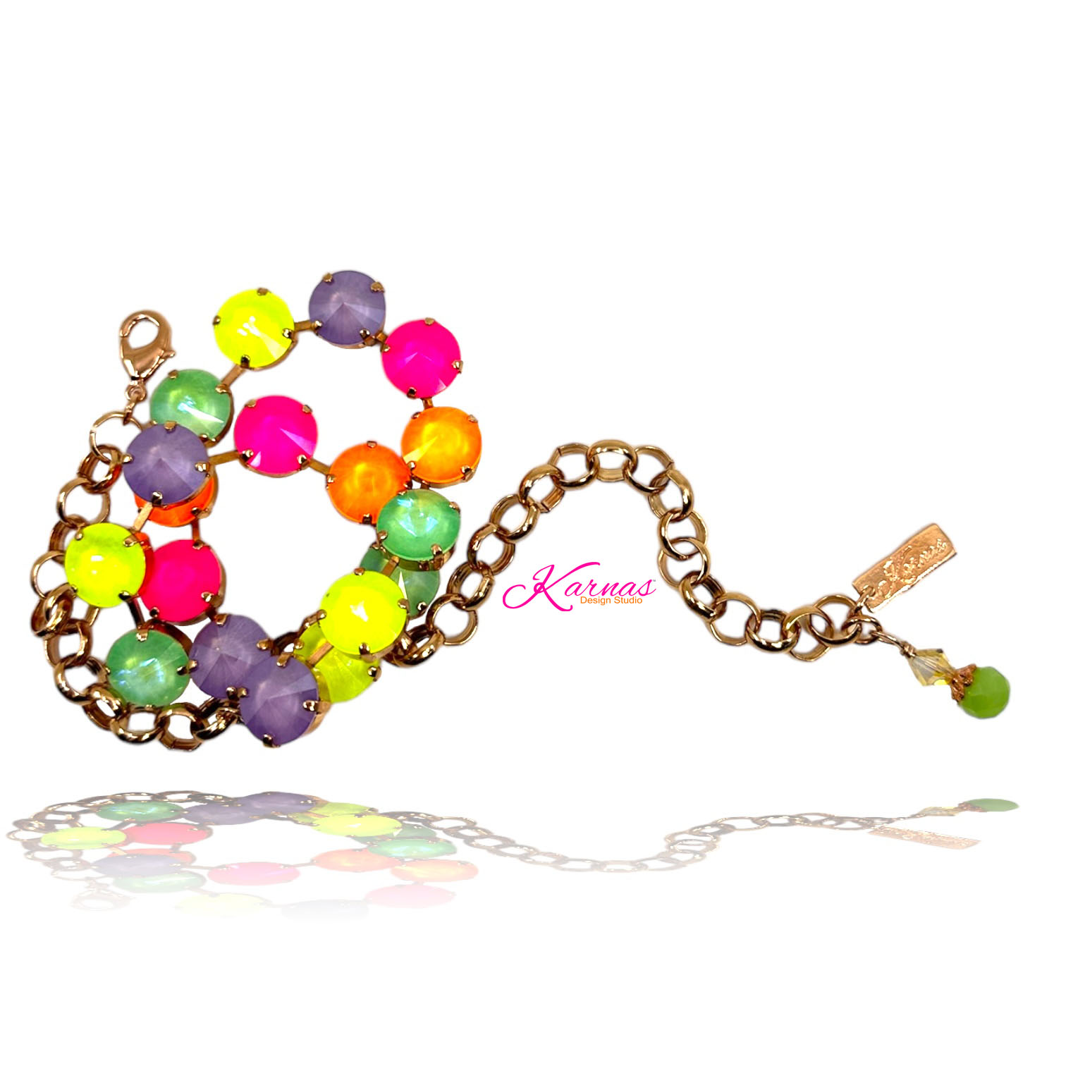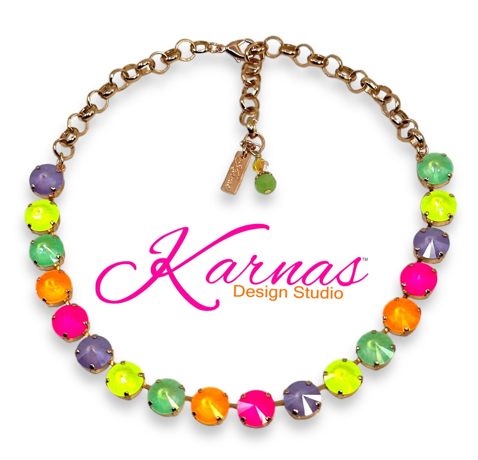 Info: These bright and vivid neon hues radiate fun, fun, FUN! Adding the delicate Crystal Lilac among them represents innocence, youthfulness, spirituality, and tranquility. This necklace is a reminder to “keep calm” and “have fun”!