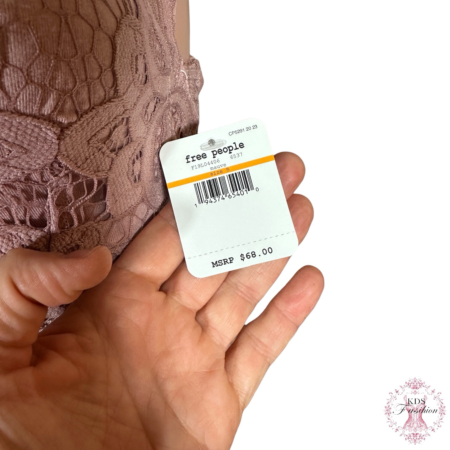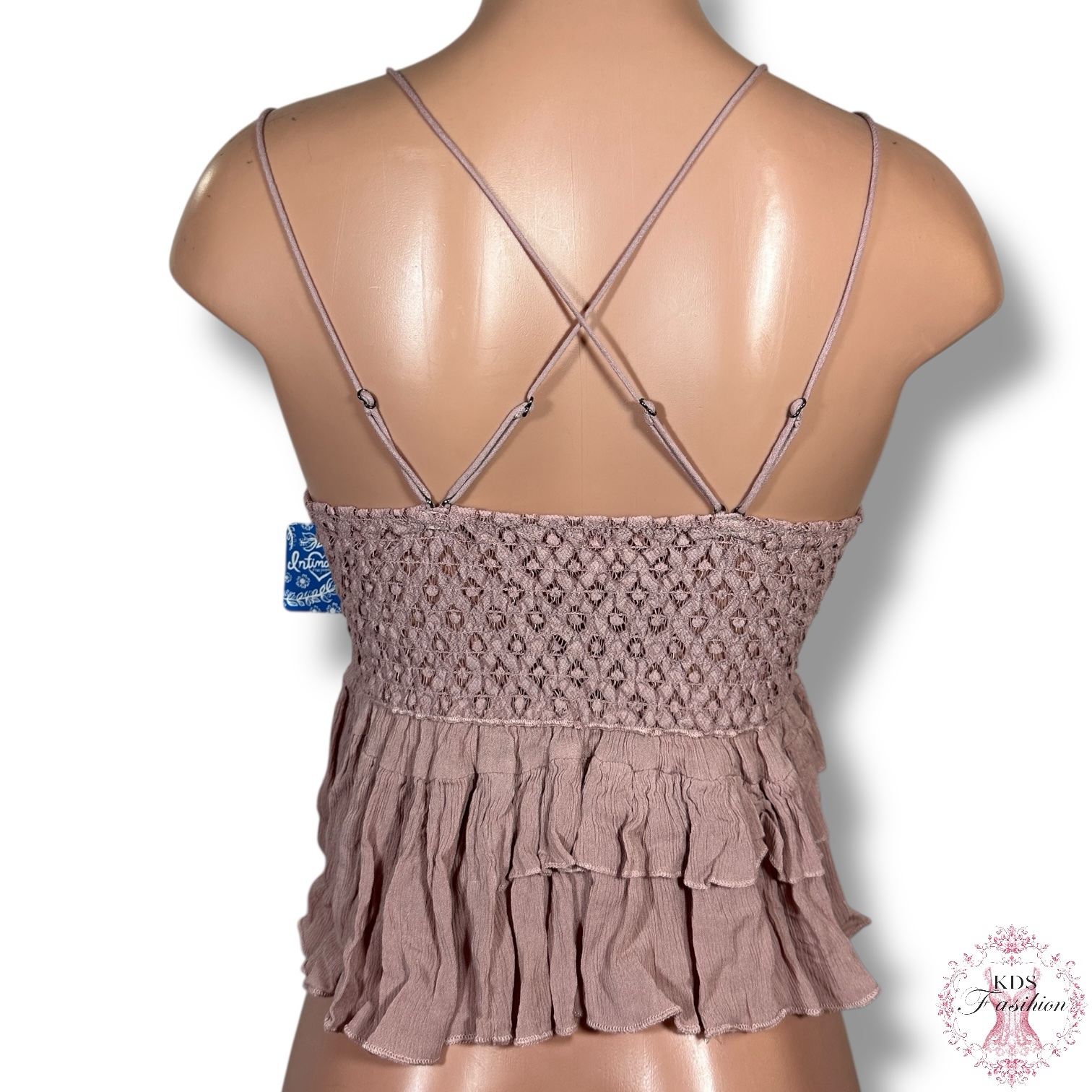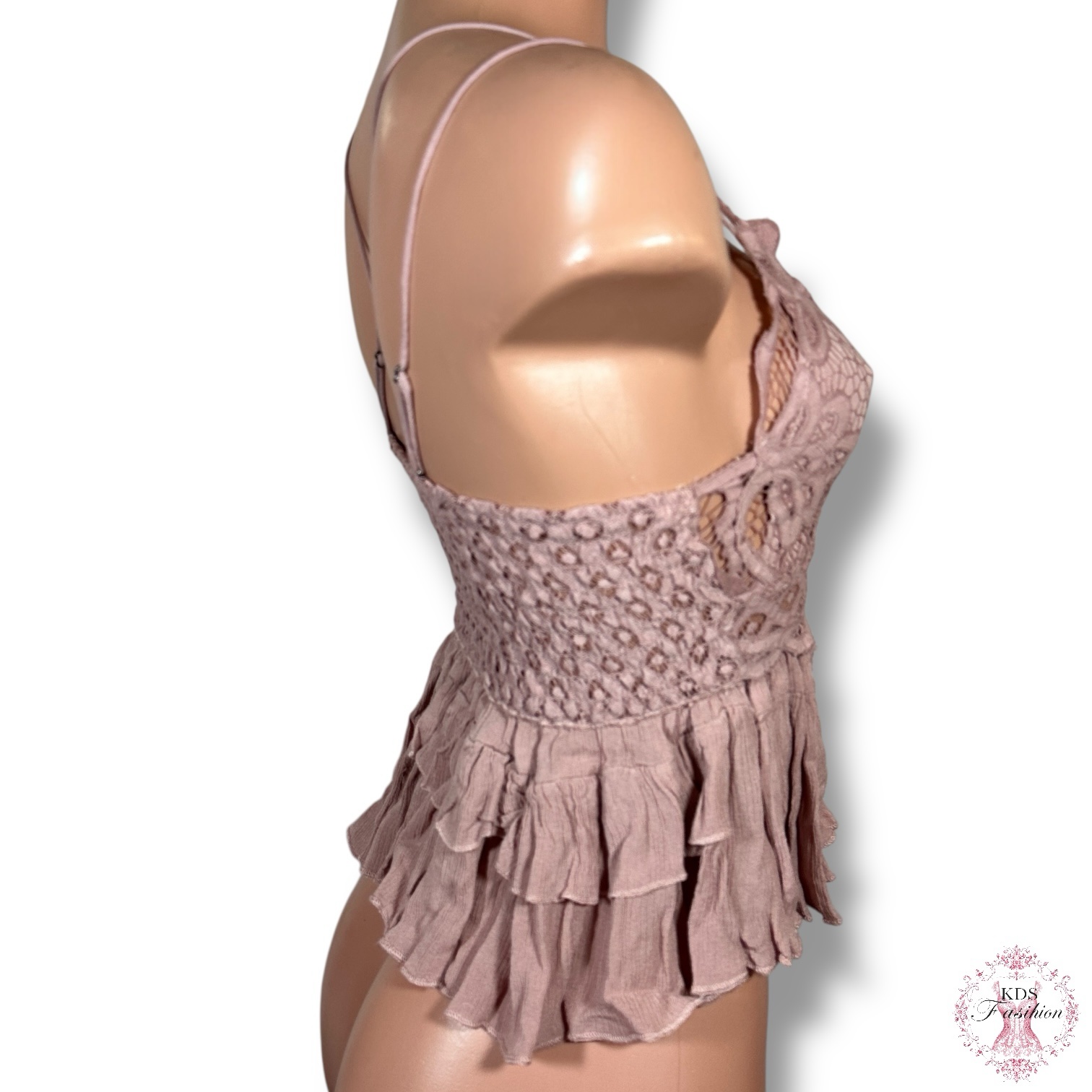 Elegant mauve lace peplum top with delicate straps. Perfect for a chic look. Brand new with tags.
