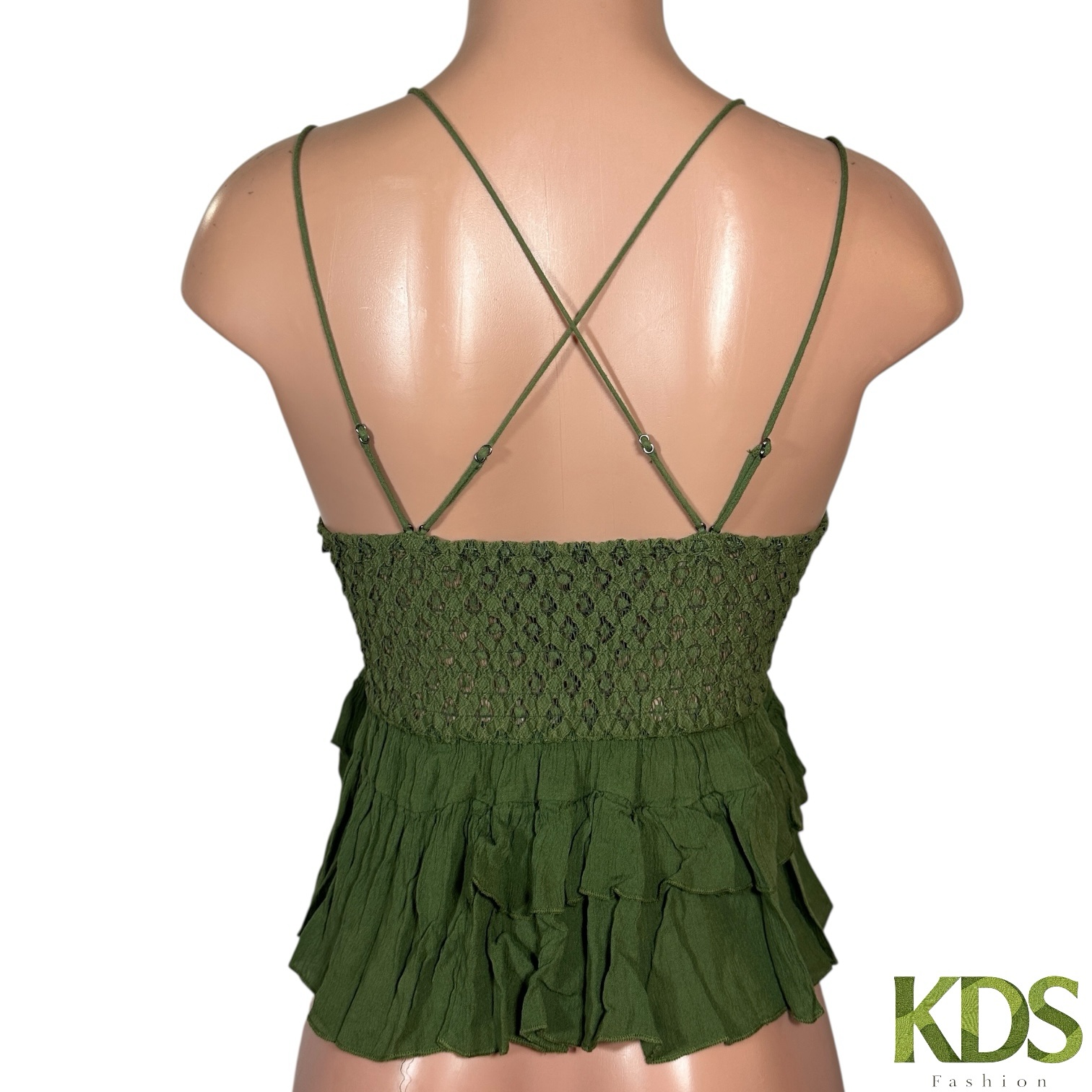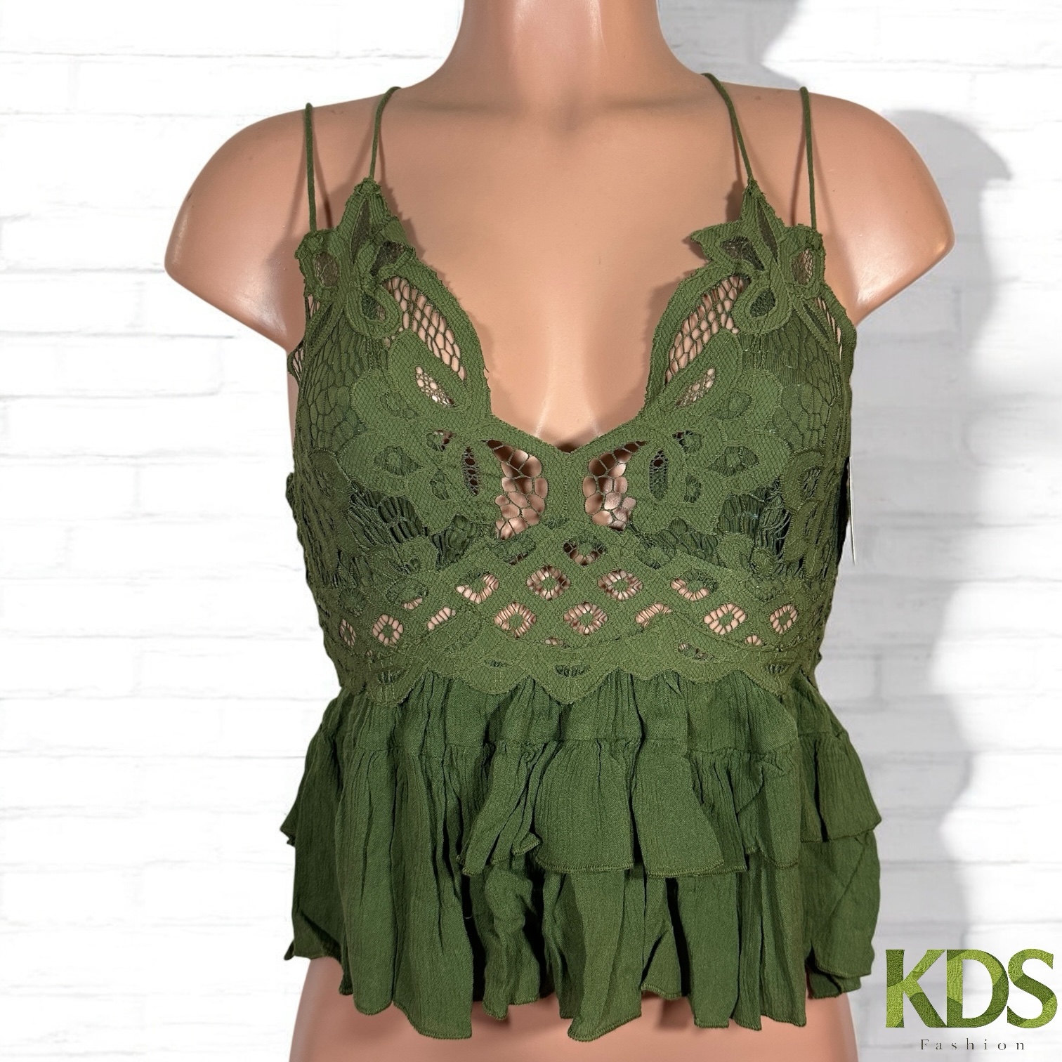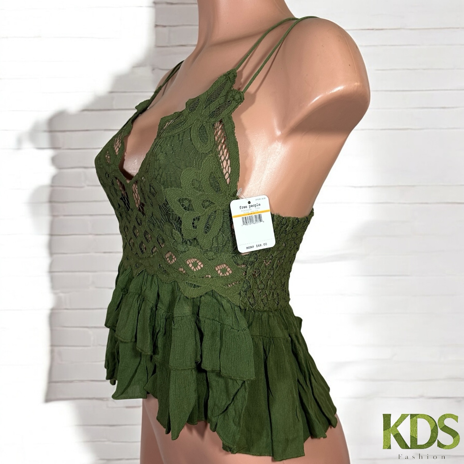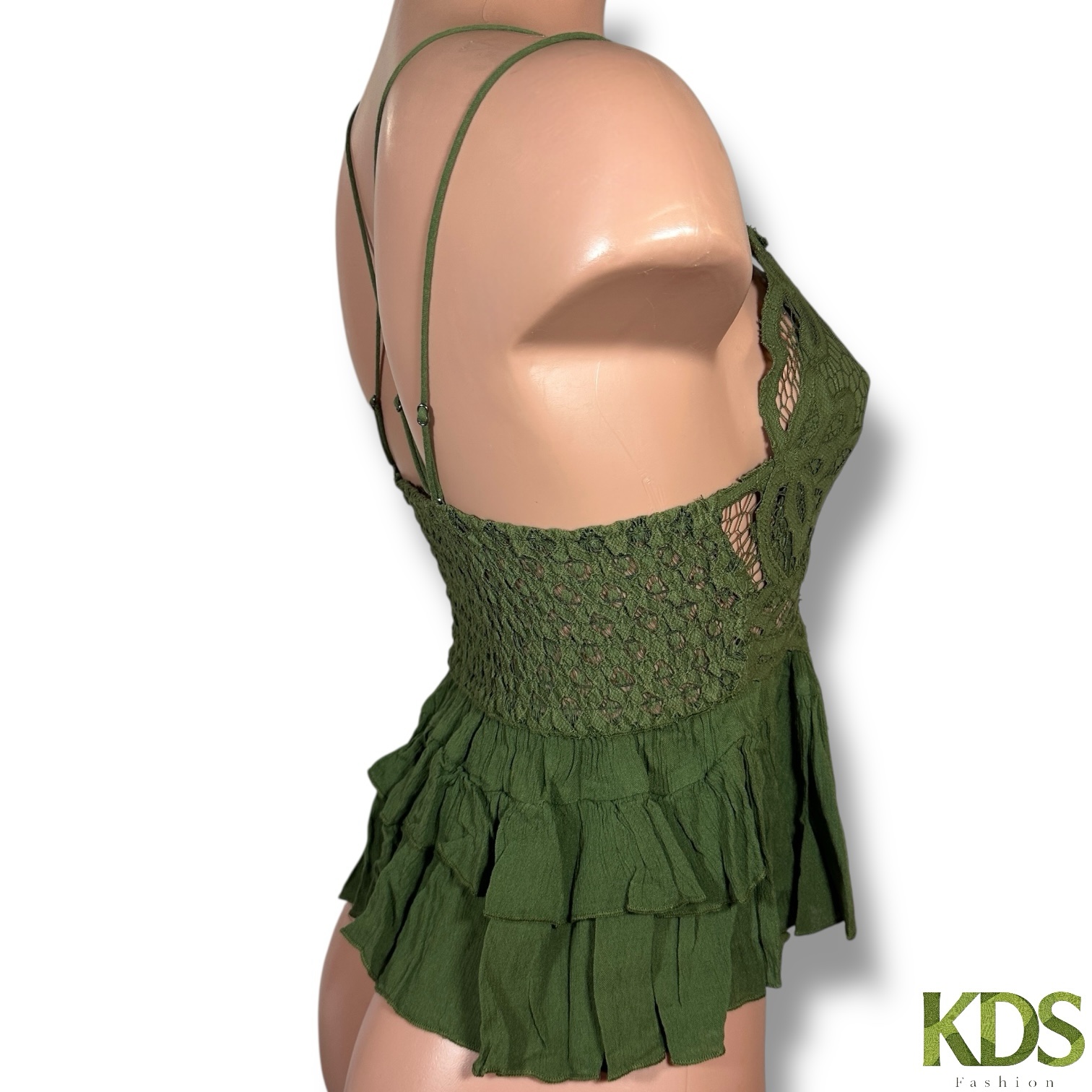 Elegant olive green lace peplum top with delicate straps. Perfect for a chic look. Brand new with tags.