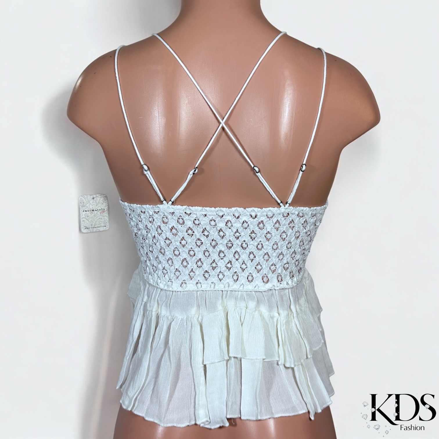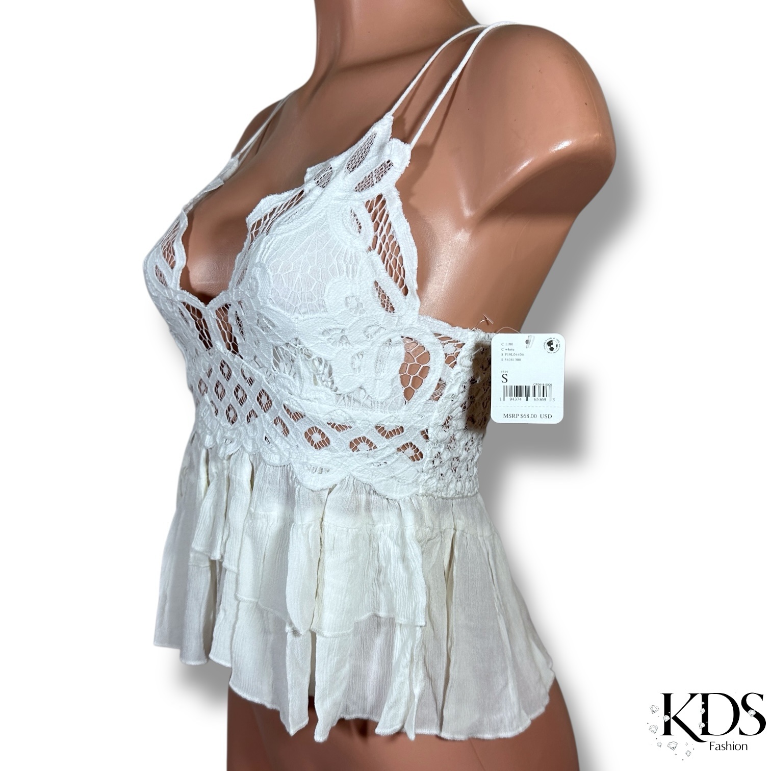 Elegant white lace peplum top with delicate straps. Perfect for a chic look. Brand new with tags.