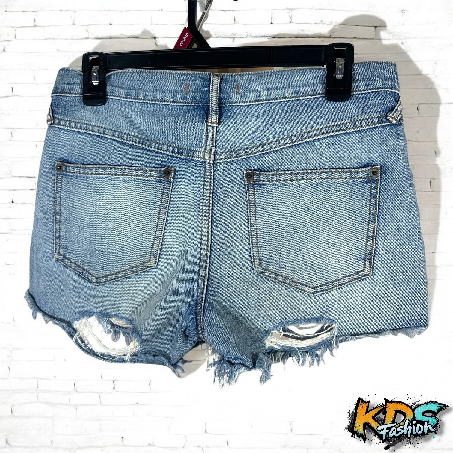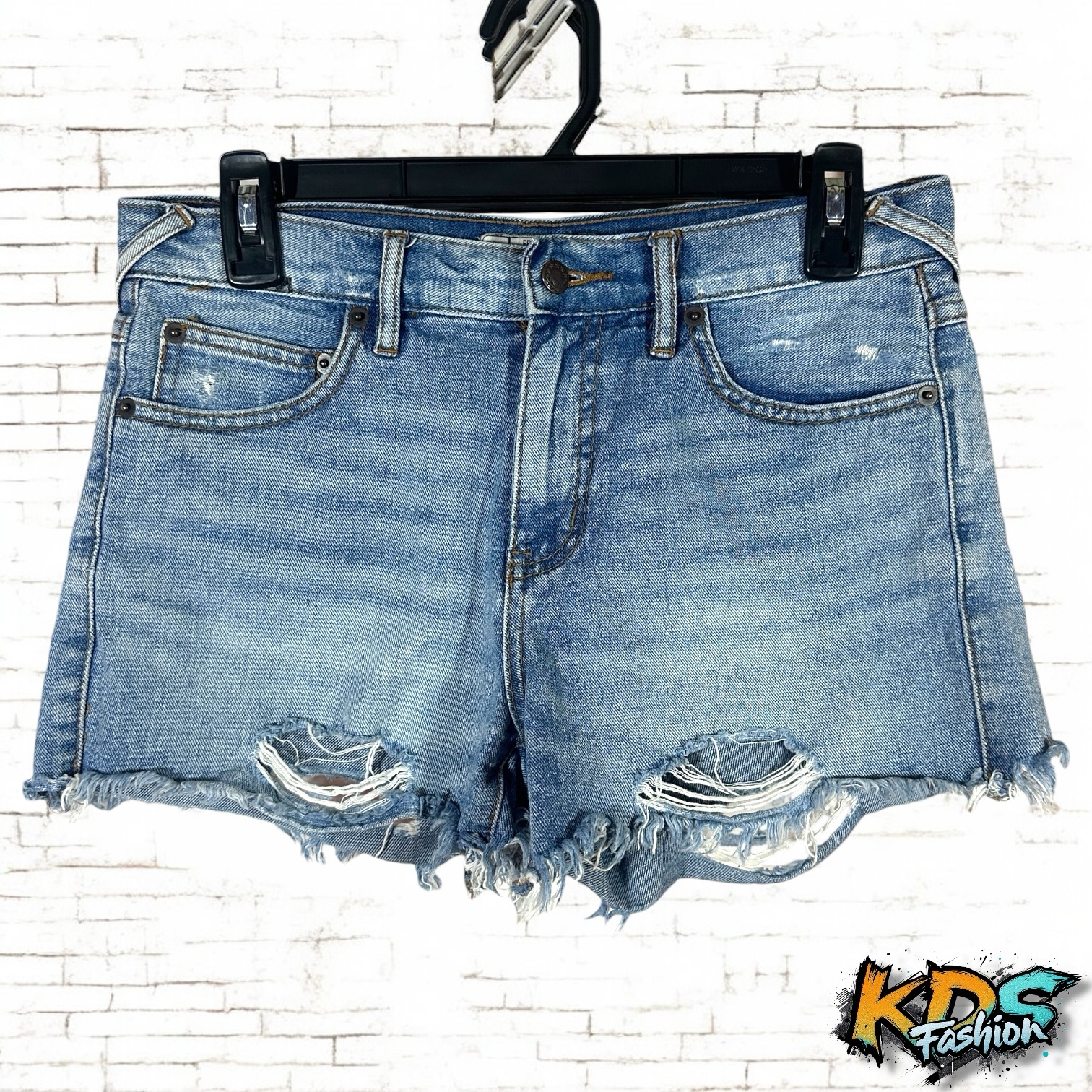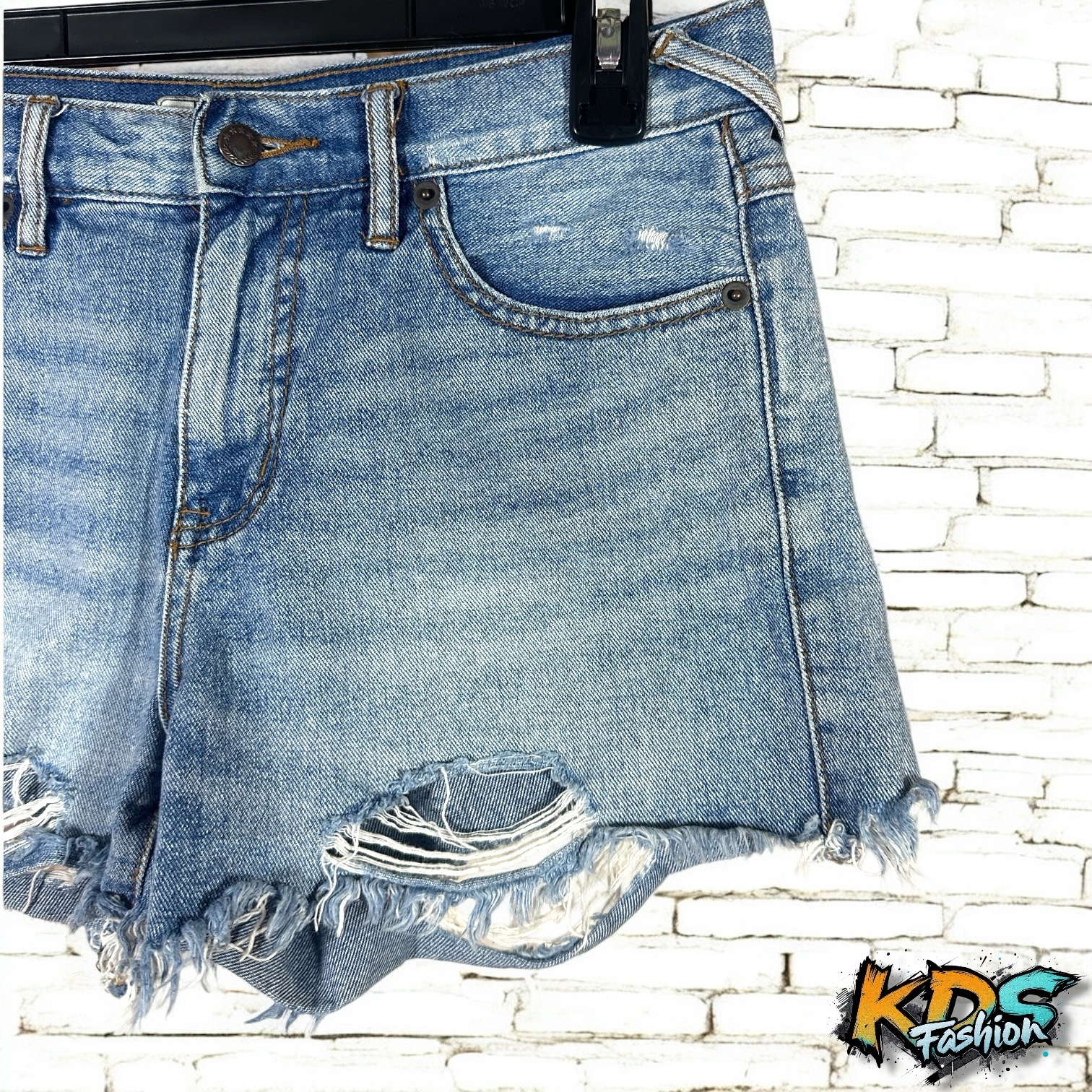 The shorts boast a vintage-inspired look with deliberate distressing and natural fading, making them ideal for casual summer outings. These shorts are in excellent condition with very little wear.