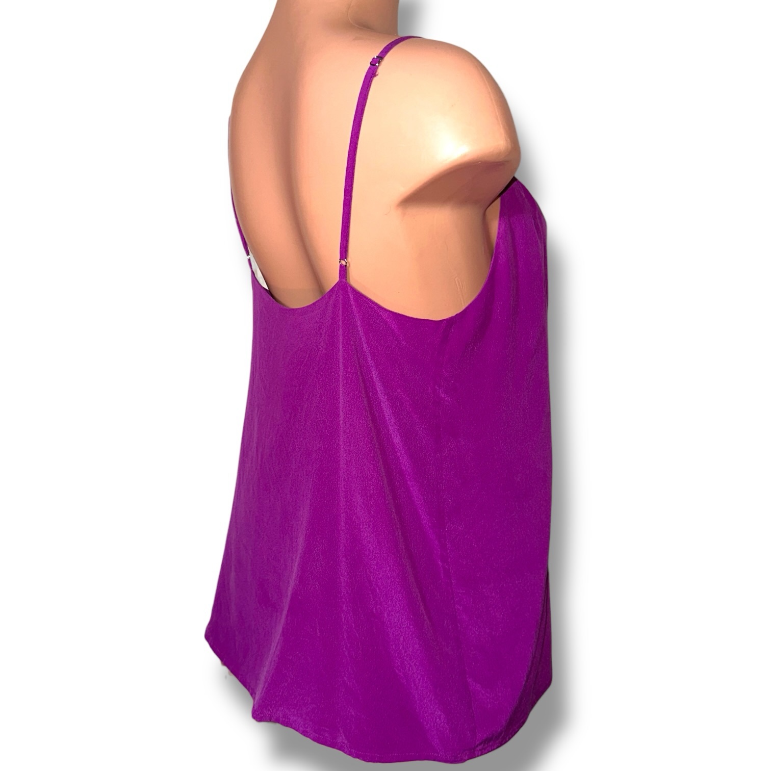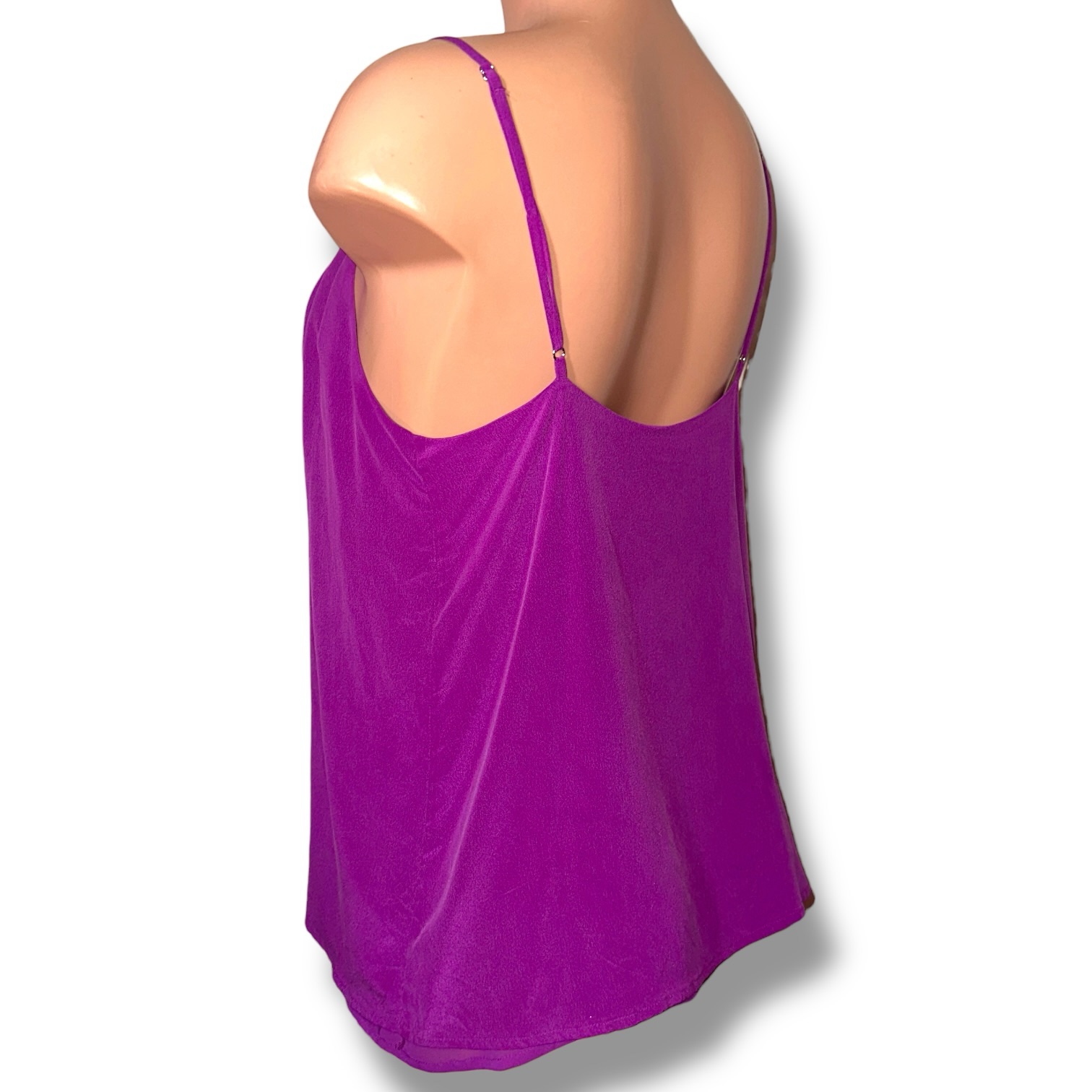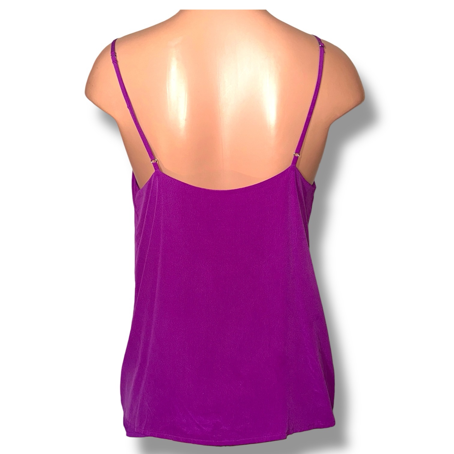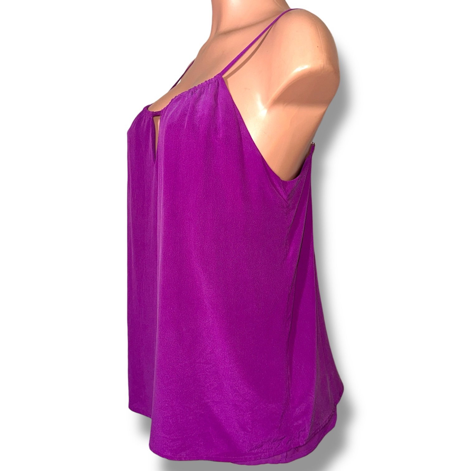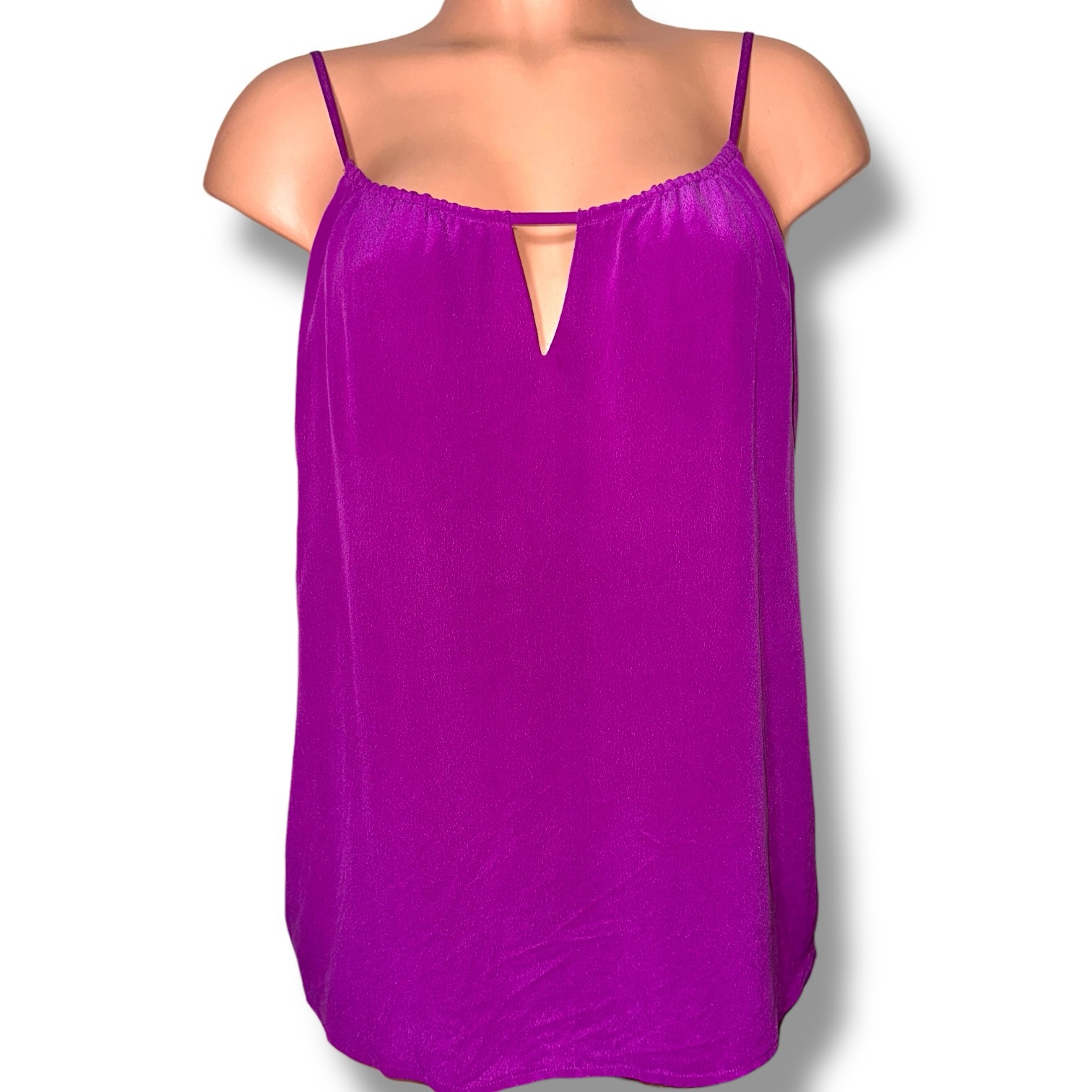 Elevate your wardrobe with this stunning Haute Hippie silk camisole, crafted in a rich, vibrant purple hue best described as electric violet with amethyst undertones. The color is bold yet refined, catching the light beautifully with a soft, fluid drape.