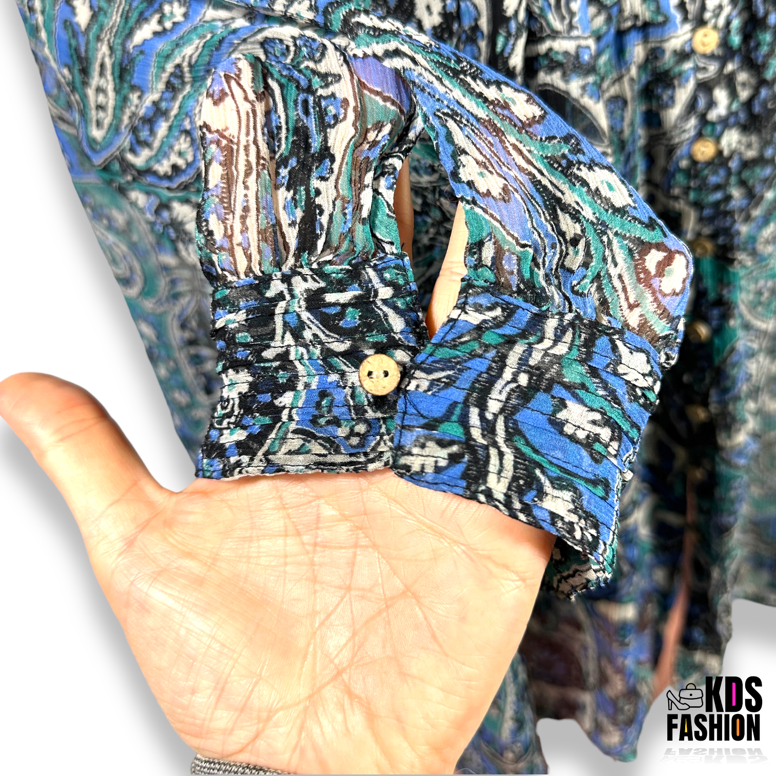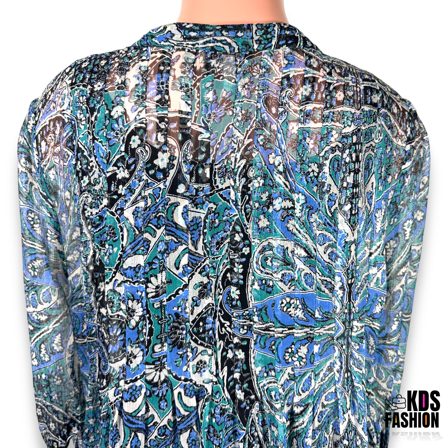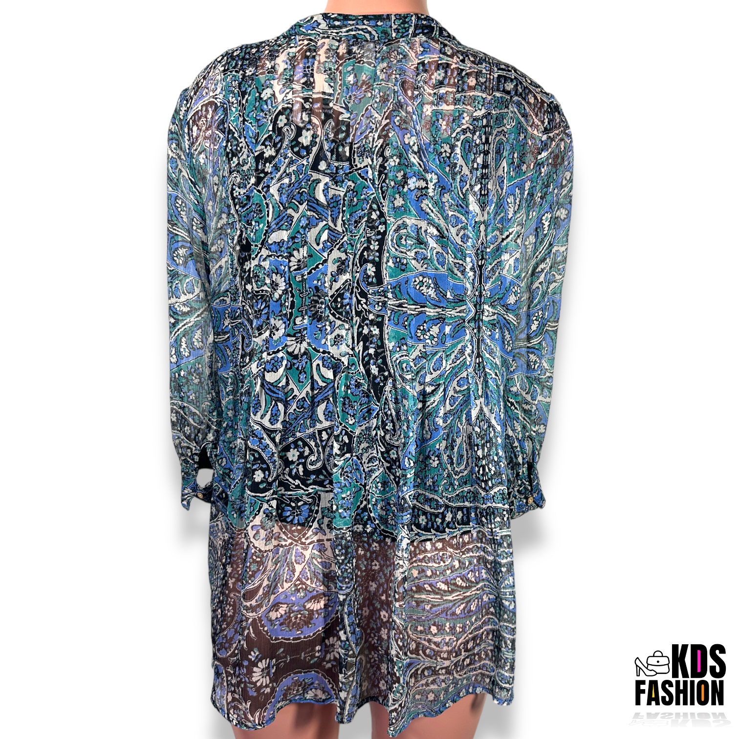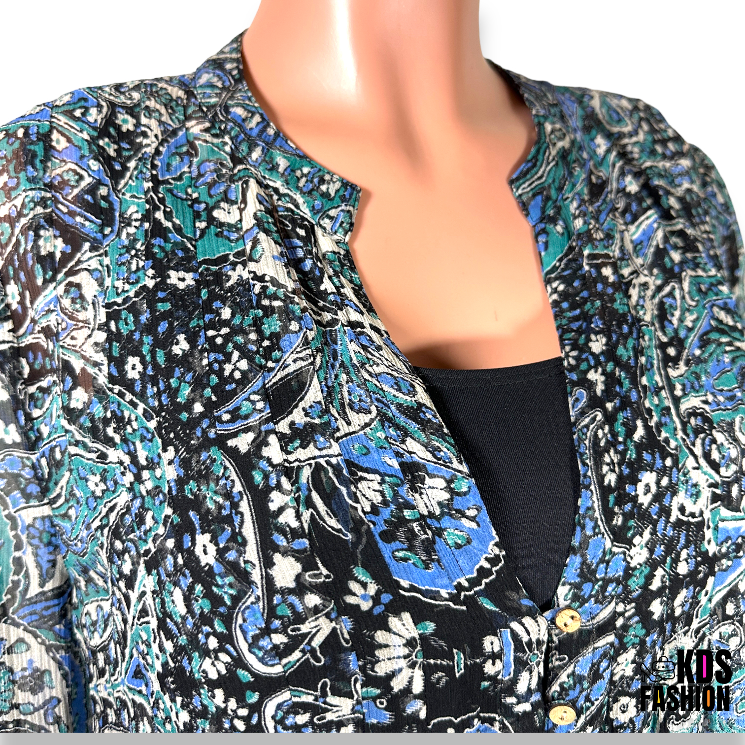 Good condition! Very high end designer. There is a small snag in the front as shown in one photo and video, not noticeable. Shirt has no other flaws, everything is shown in photos. 100% silk (material tag removed). This top is sheer, there is no black tank top included. Get a $329 designer shirt for a fraction of the cost!