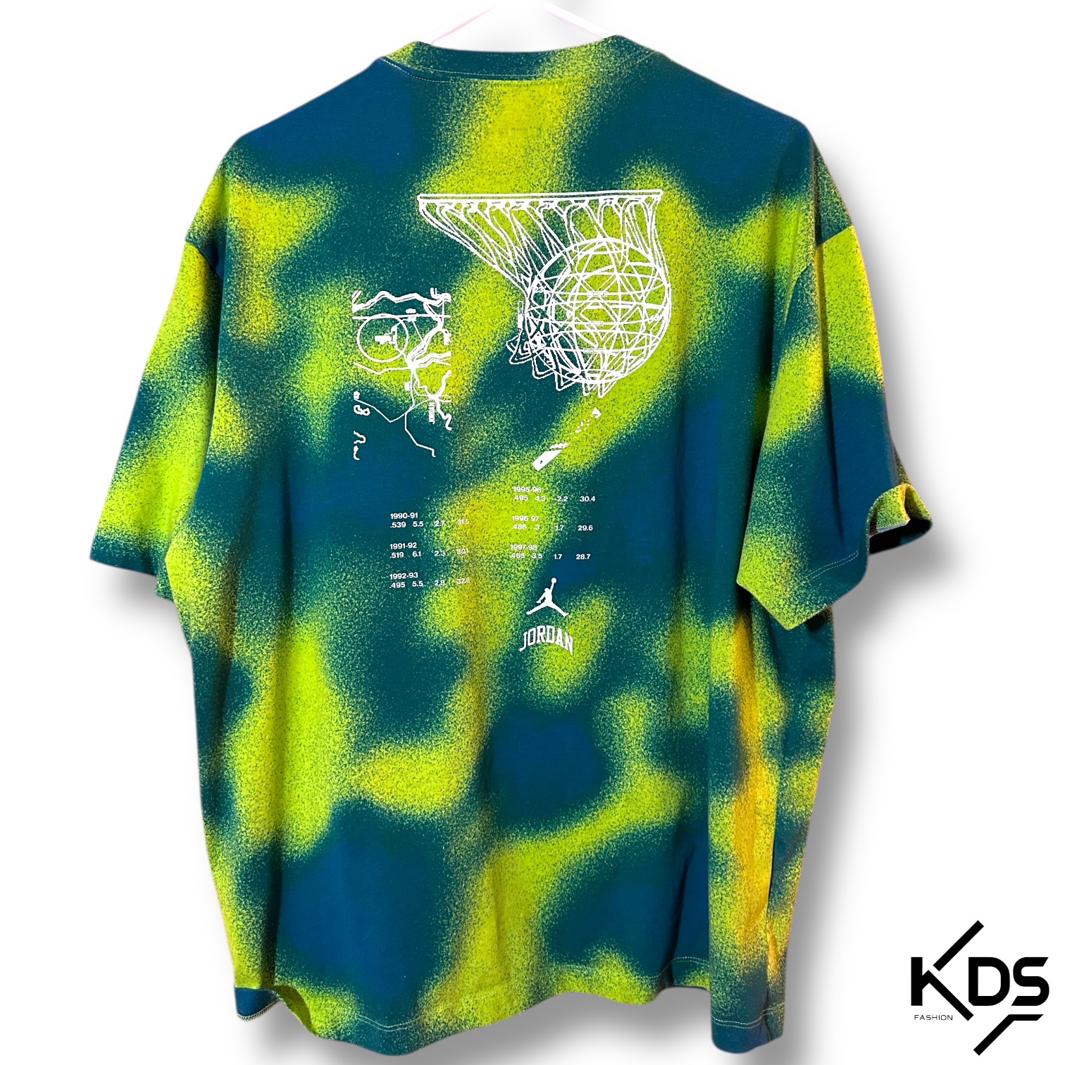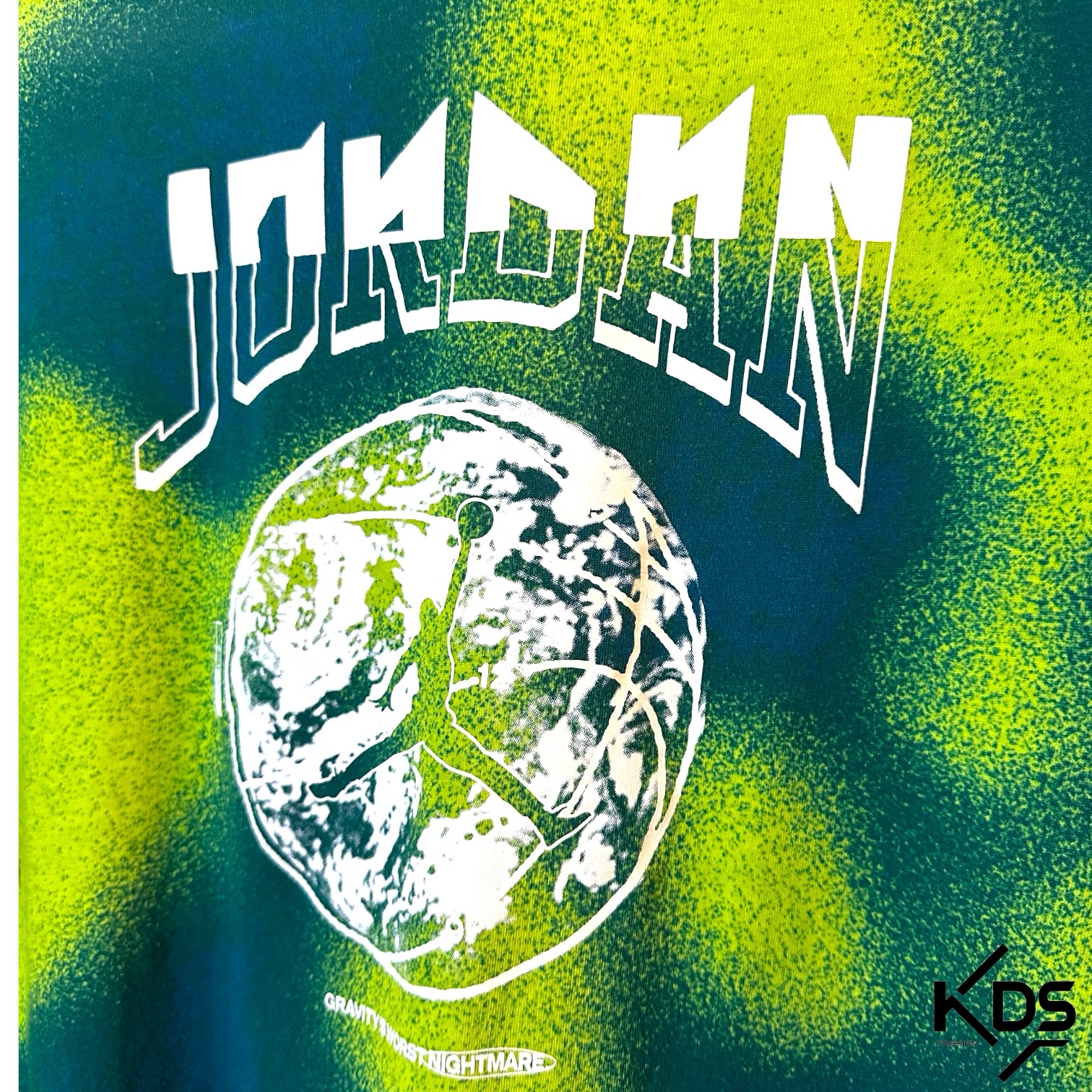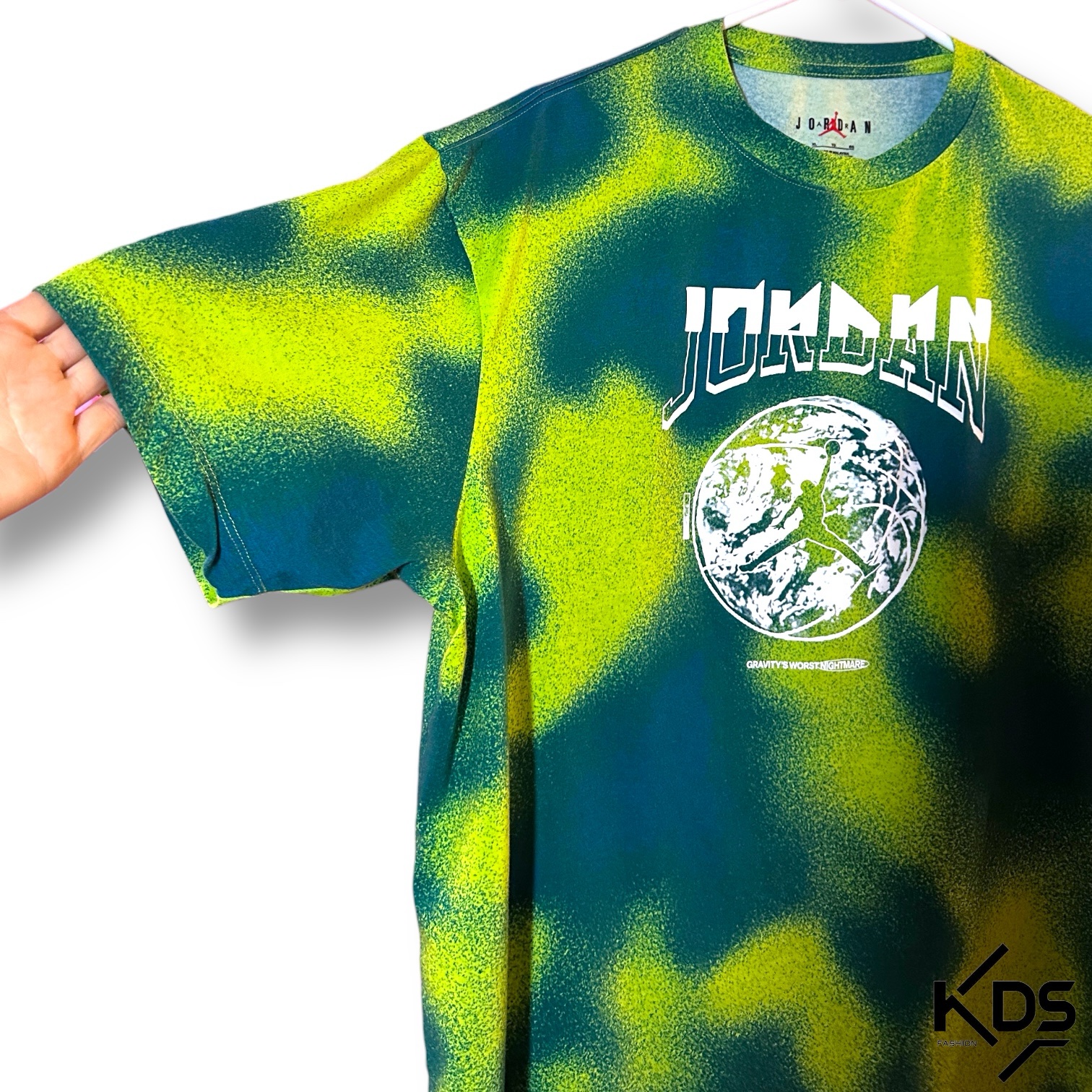 Authentic Jordan short-sleeve graphic T-shirt featuring a bold green and blue tie-dye pattern with the iconic Jordan logo and globe graphic on the front. Soft, comfortable cotton-blend fabric with a classic crew neckline. A standout piece for streetwear, casual wear, or athletic styling.