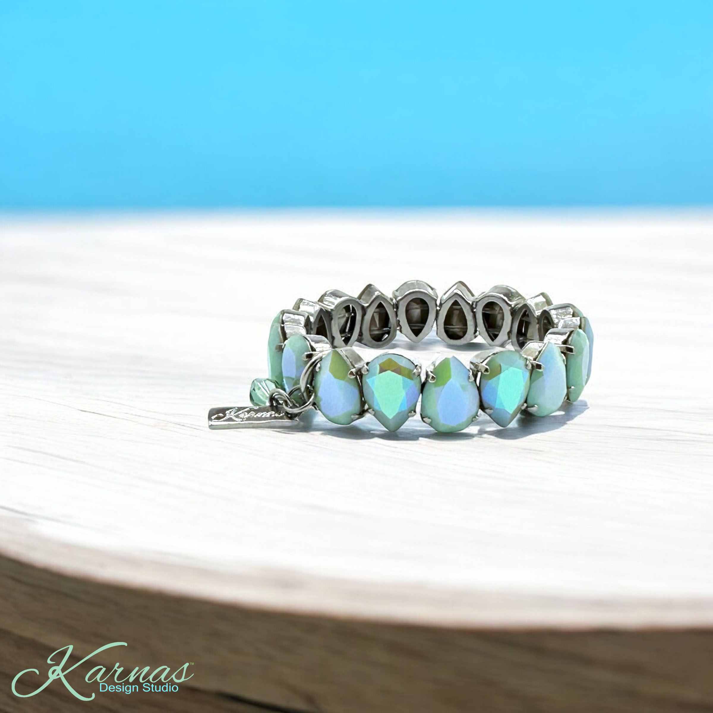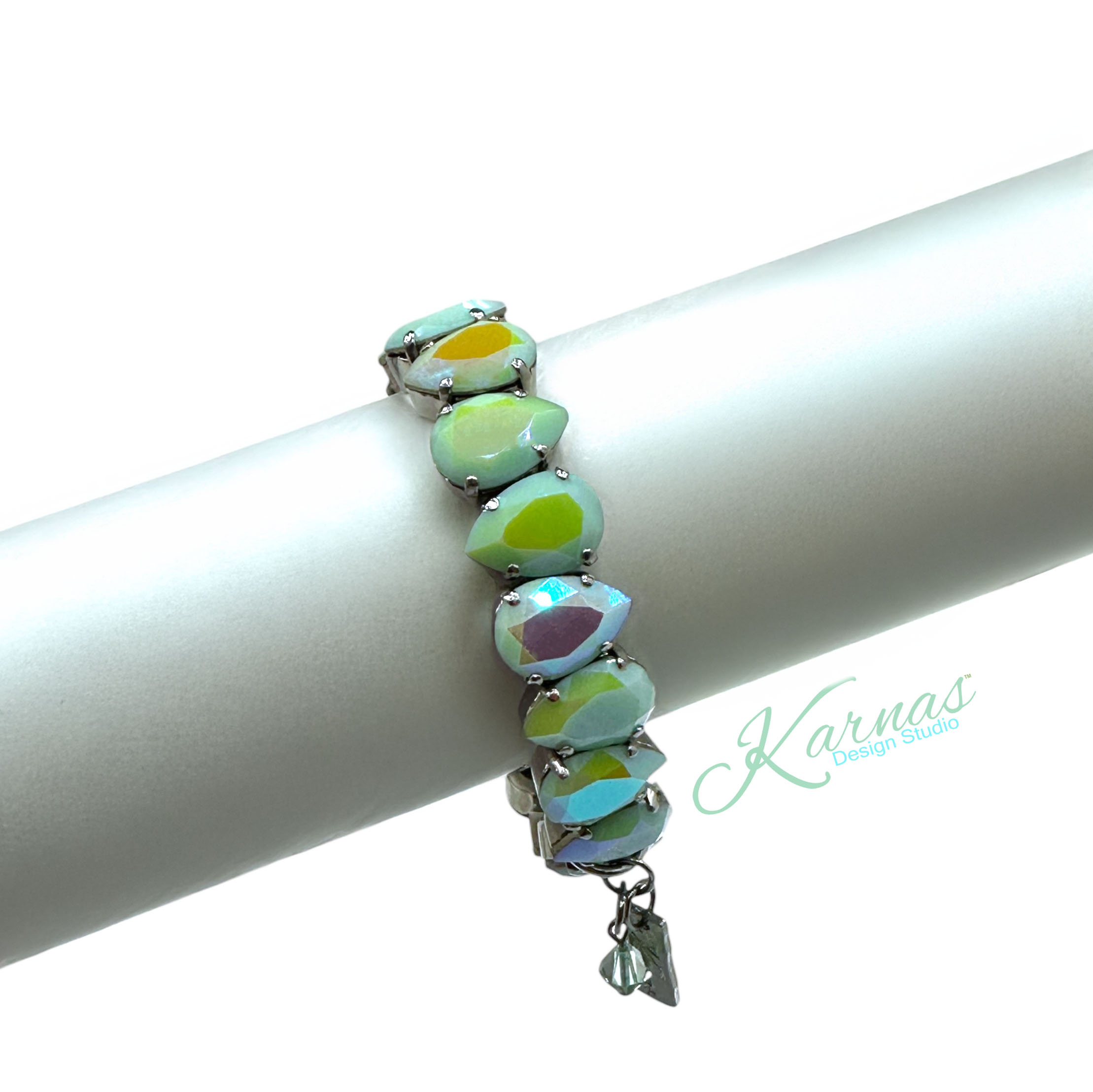 What an amazing crystal! Mint Alabaster was discontinued many years ago, however, we held onto these stunning vintage crystals. The solid, mint base color is coated with an iridescent finish called Glacier Blue. These crystals will vary in hue and color, each one is different and unique on these vintage stones. Get them while they last, they are rare and quite unique.