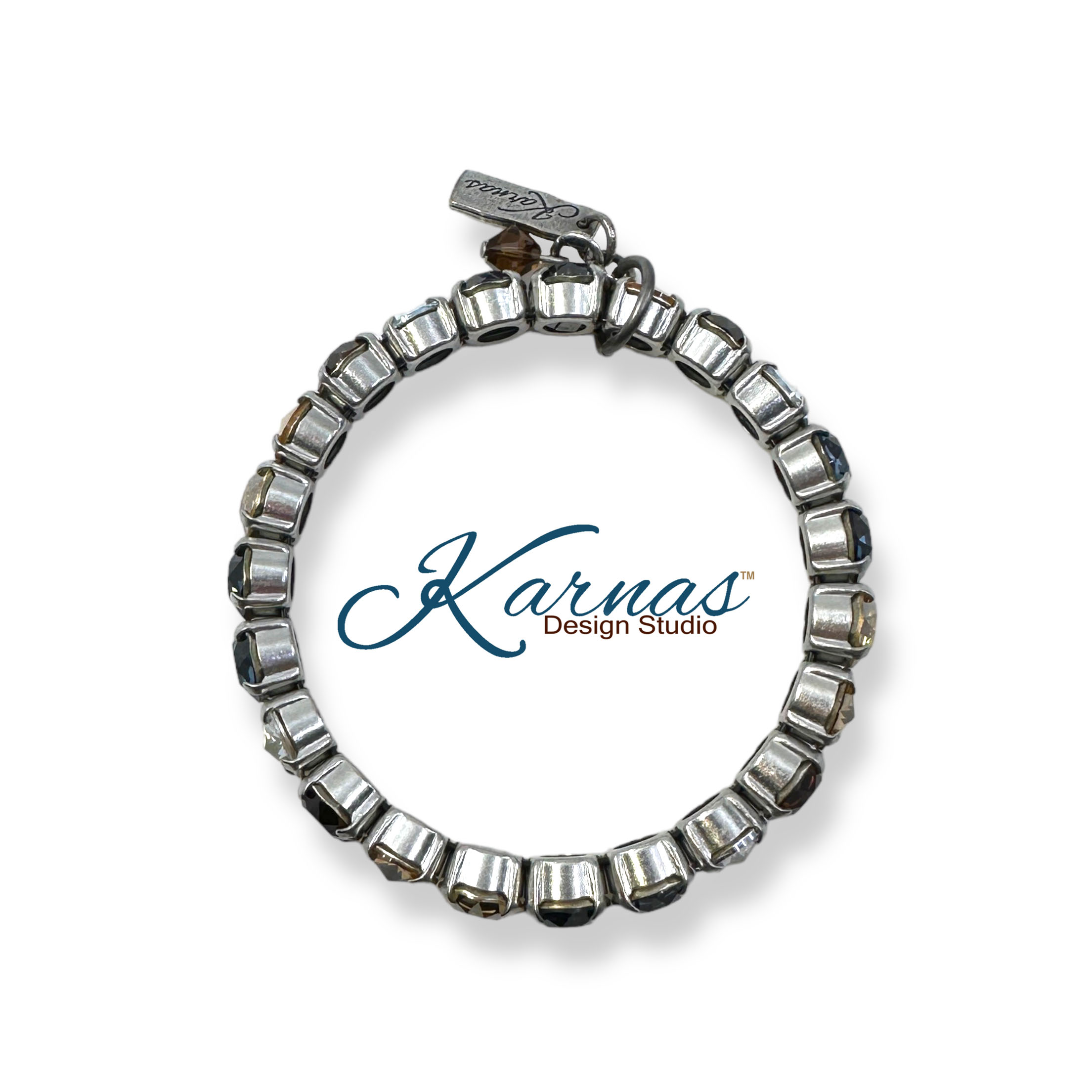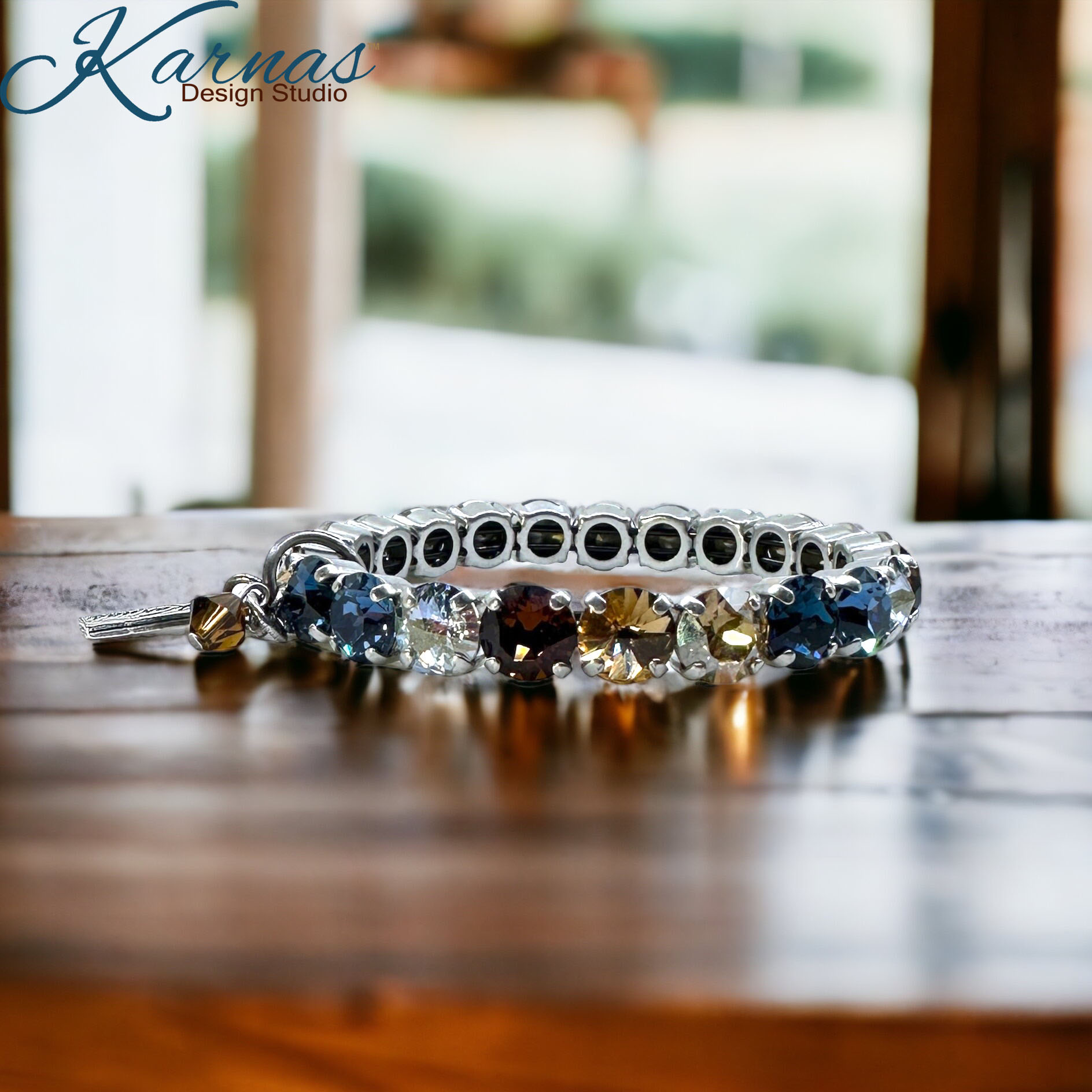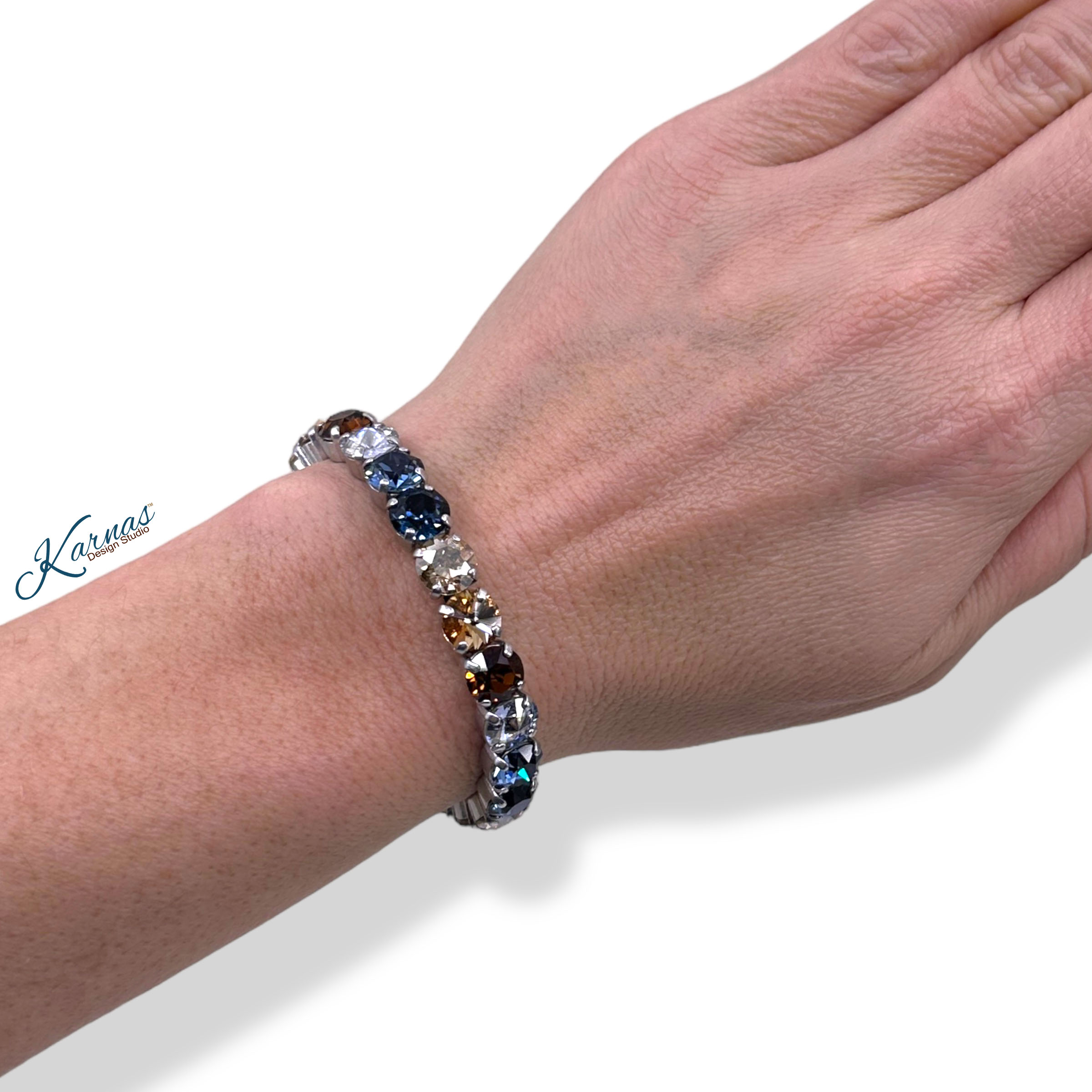 A harmonious blend of earthy browns and soothing blues that effortlessly captures the essence of rustic elegance. Featuring a combination of rich brown crystals, reminiscent of the rustic countryside, and delicate blue crystals, representing the tranquil hues of the sky. This bracelet is both captivating and unique!