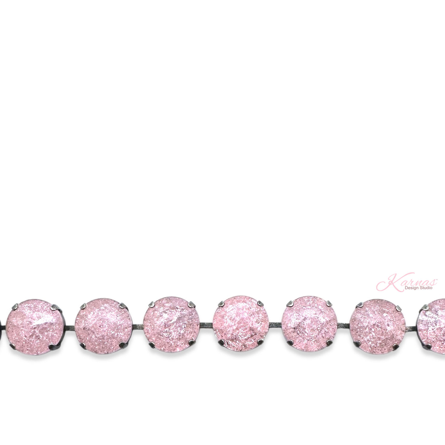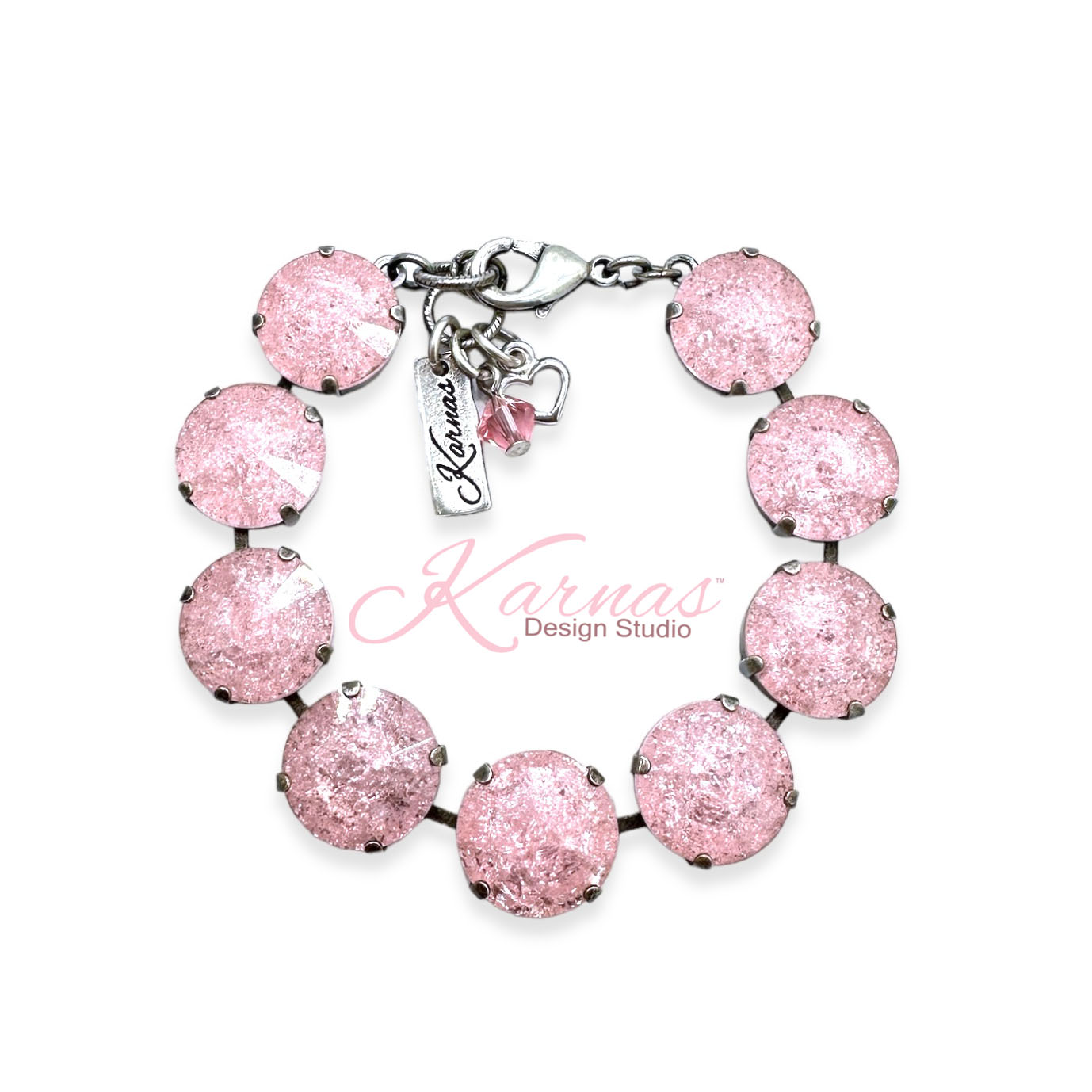 These genuine crystals are one-of-a-kind! They look like they’ve been shattered but are perfectly smooth on top and still reflect the light. The color can be described as a light pink or baby pink. The crystal size is 14mm or .55″ in diameter with a rivoli cut. The finish shown in these photos for the bracelet is Antique Silver. Each bracelet has a standard length of about 7-8″. Please see the drop down menus for additional options (if available).