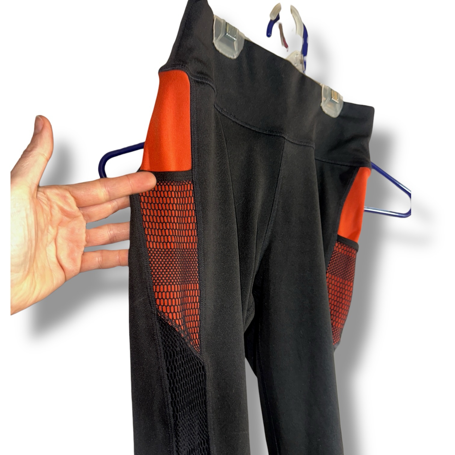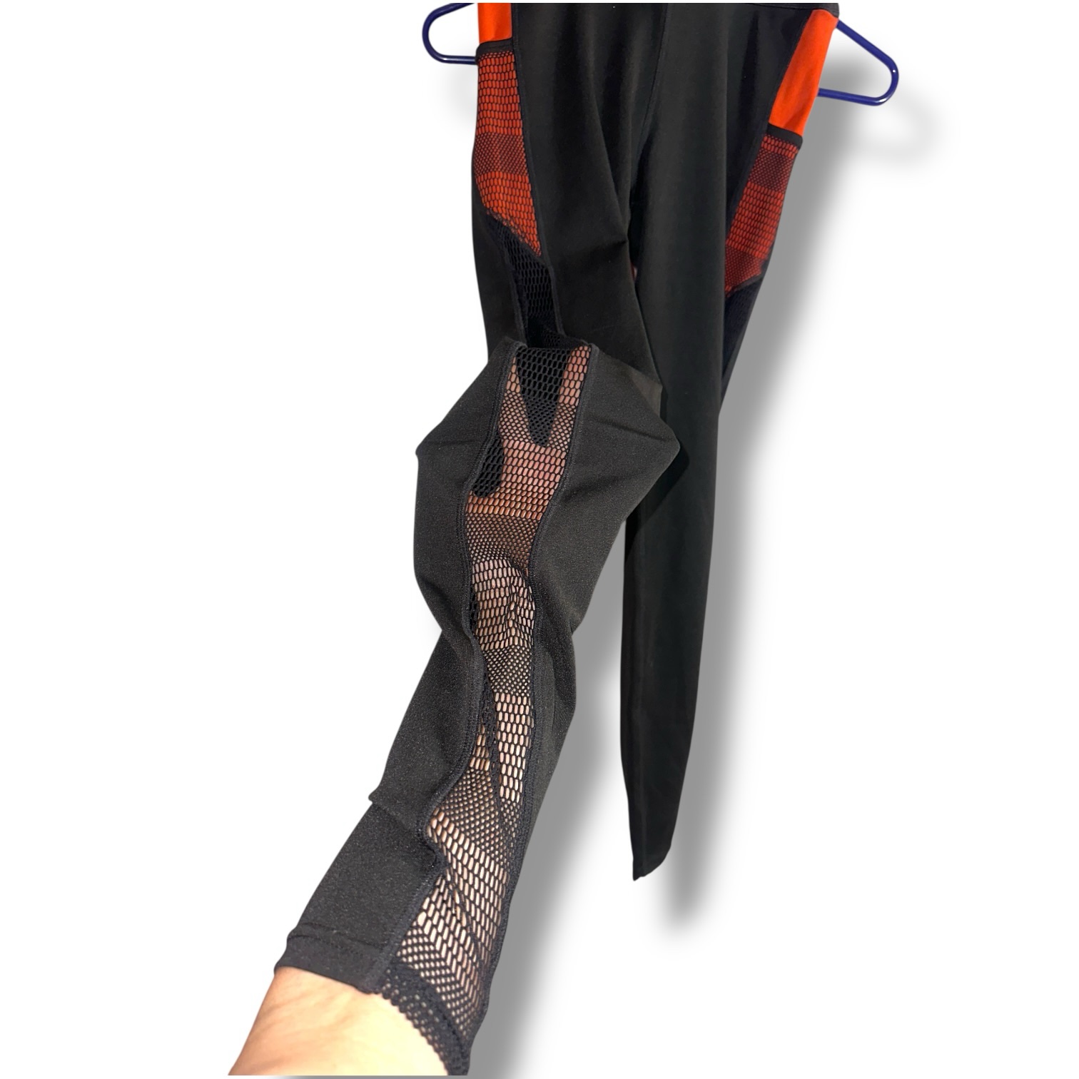 POP Fit high-waisted performance leggings in classic black with bold orange mesh panel detailing.