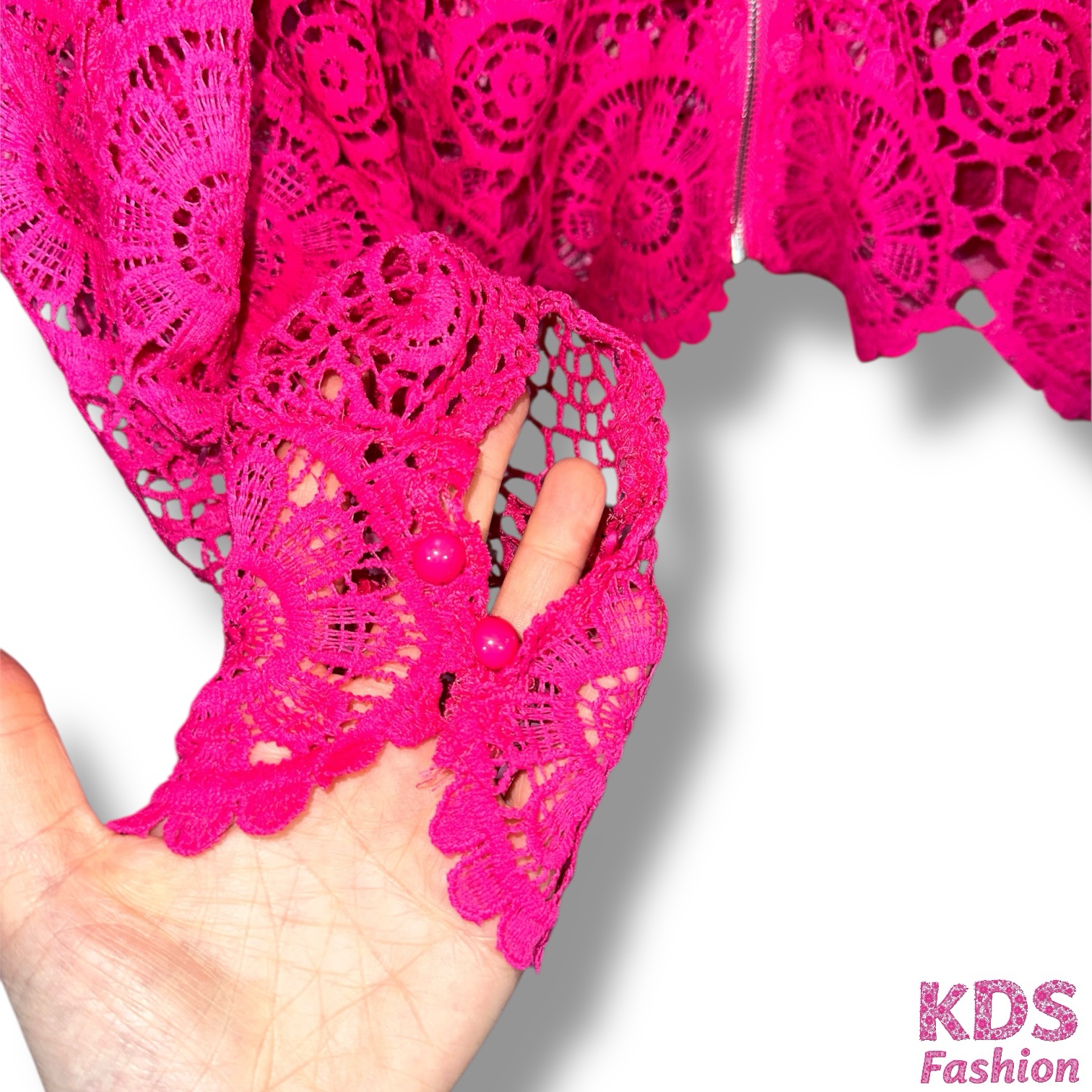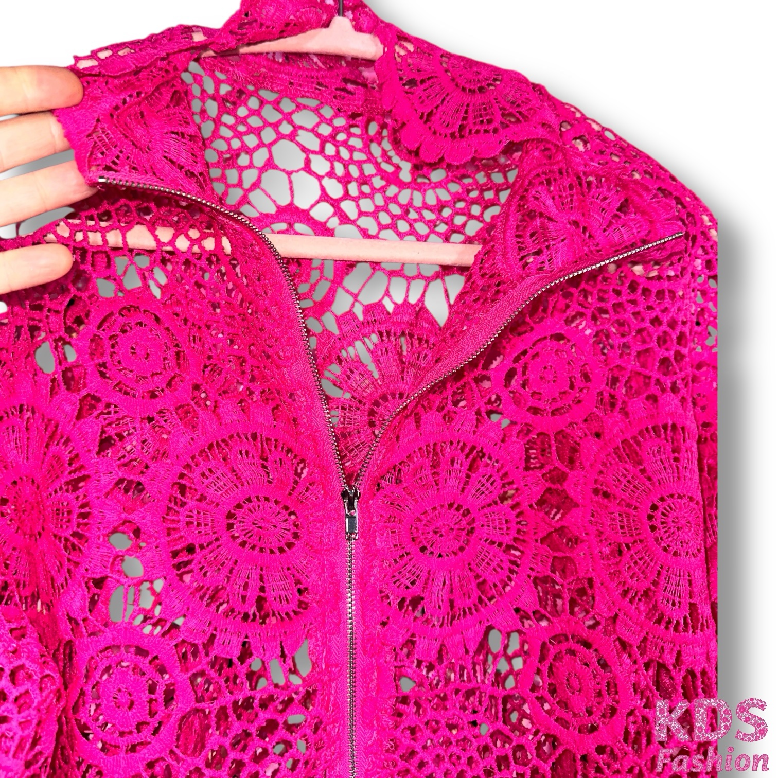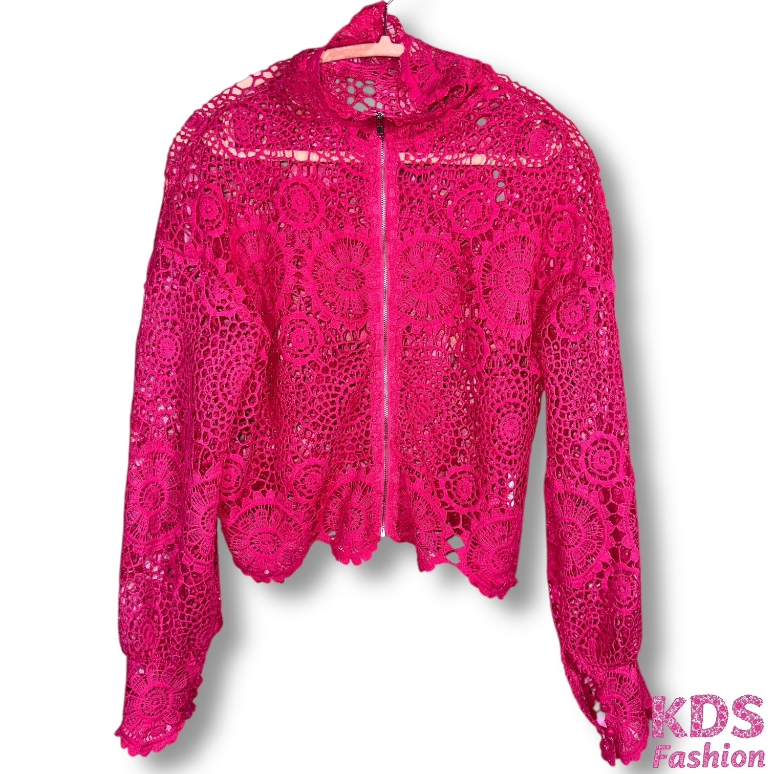 Turn heads in this bold, hot pink lace jacket that’s all about drama and style! This piece features a zip-front closure, intricate lace detailing, and gorgeous balloon sleeves that give it that elevated, fashion-forward look. Perfect layered over a tank, bodysuit, or dress for an instant outfit upgrade.