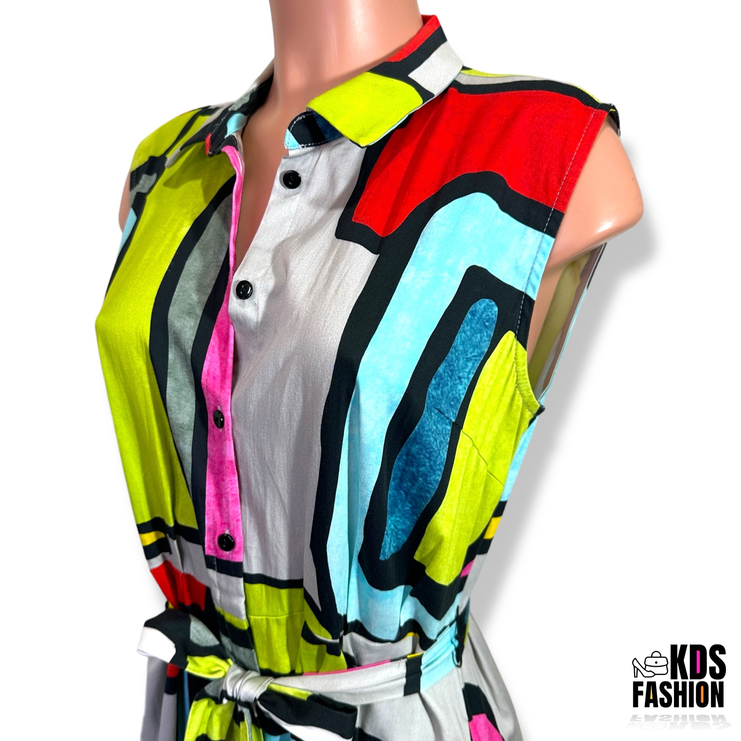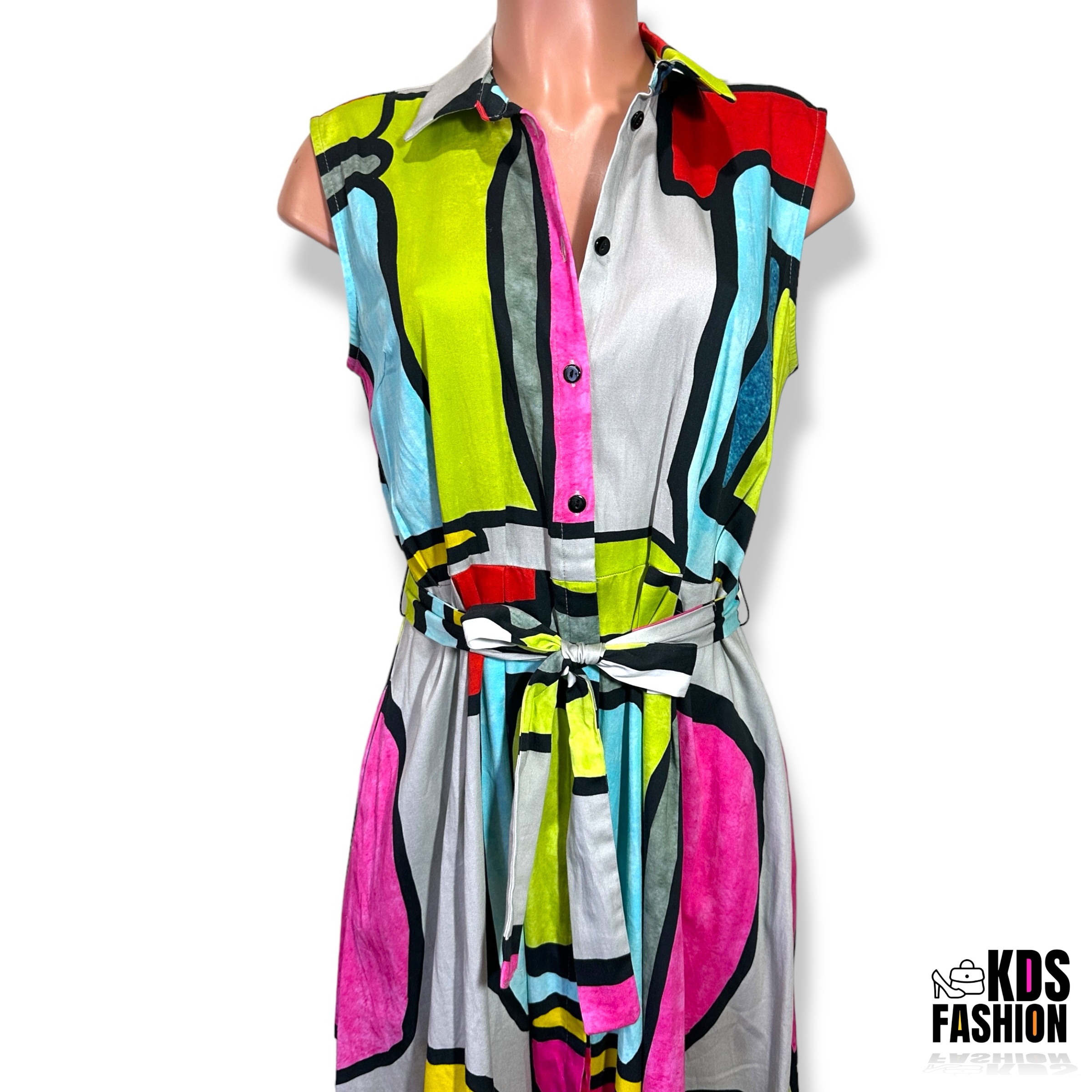 This Simply Art by Dolcezza RARE Sleeveless Belted Button Front Midi Dress MD is a stunning and modern piece with stretch fabric, a full button front design, hidden buttons from waist down, and pockets on both sides. The dress includes a fabric belt and features painting designs by artist Irene Orlov. It’s a rare find and style that is as modern as it gets, in like new condition. This dress is simply stunning! 20″ chest and 50″ length.