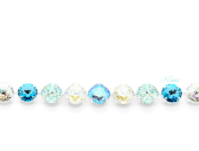 12mm or .47″ diameter genuine crystals in a cushion and rivoli cut.