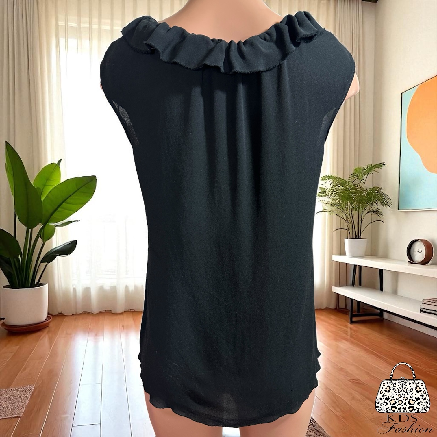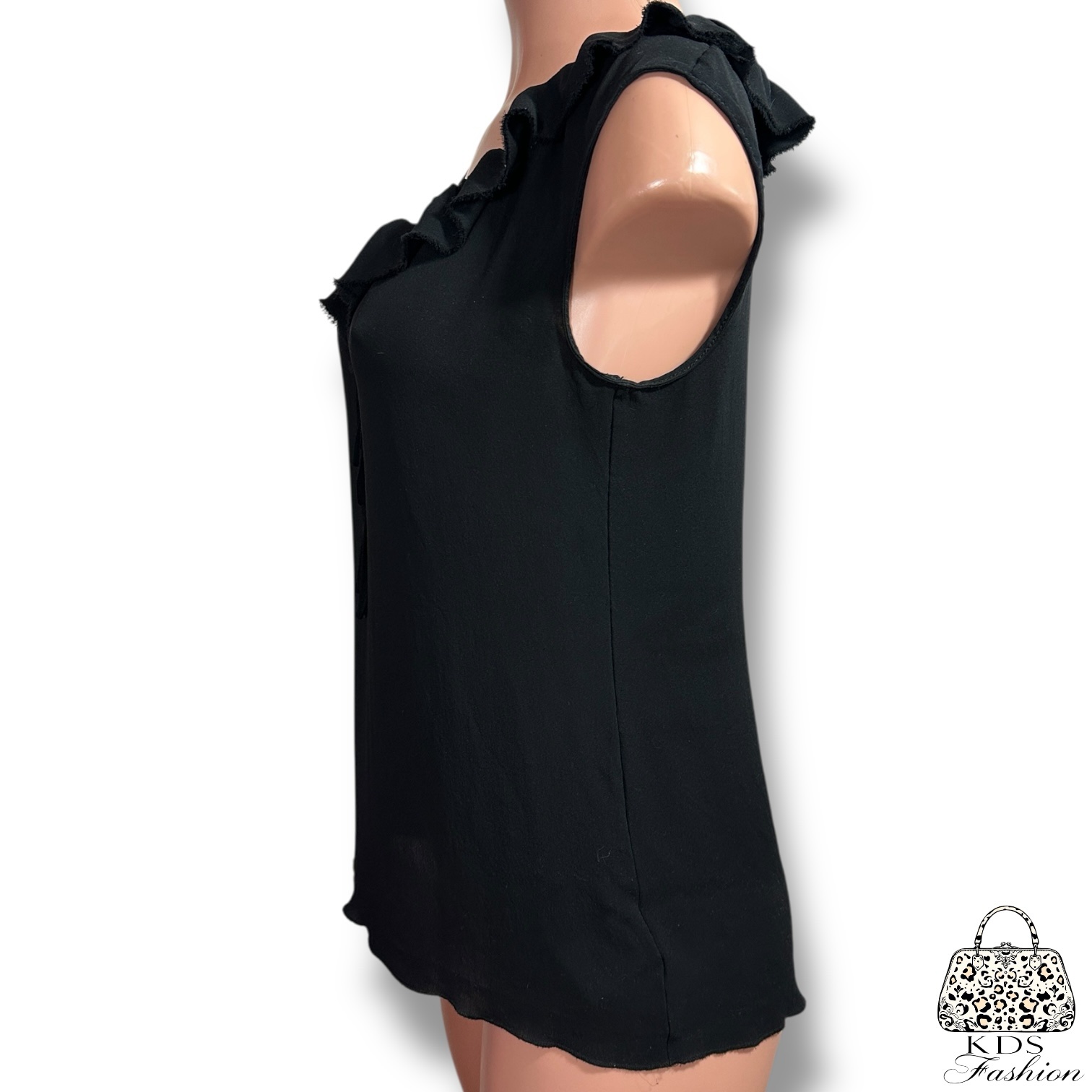Elegant black ruffle adds a touch of sophistication.