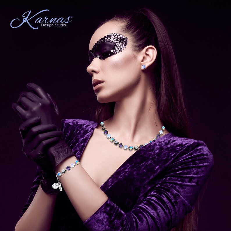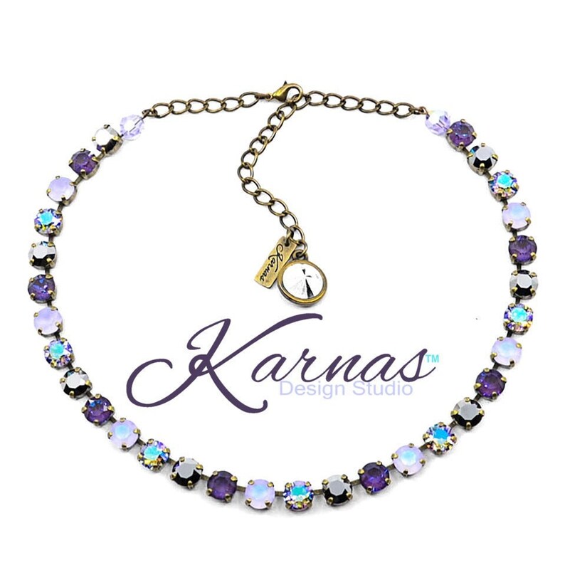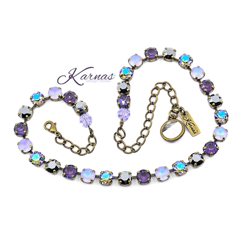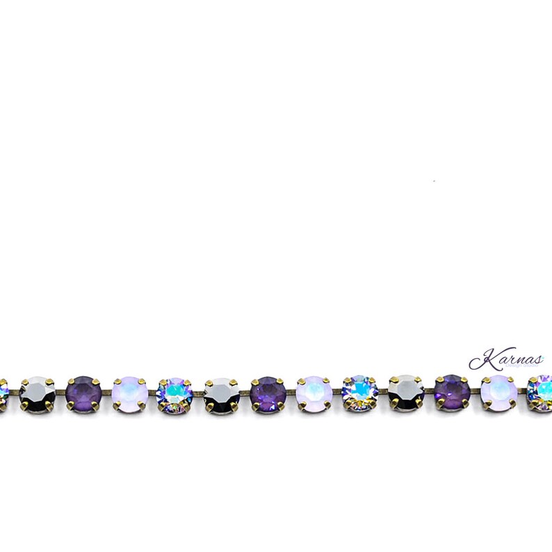 Finish shown in photos is Antique Brass. The standard length is 14.5-19″ usable length (approximately, each piece is unique). Charms will include the bezel and 12mm crystal as seen. Tag only option includes small accent crystal and tag. VIDEO is showing an Antique Silver bracelet in the Twisted Iris color scheme.