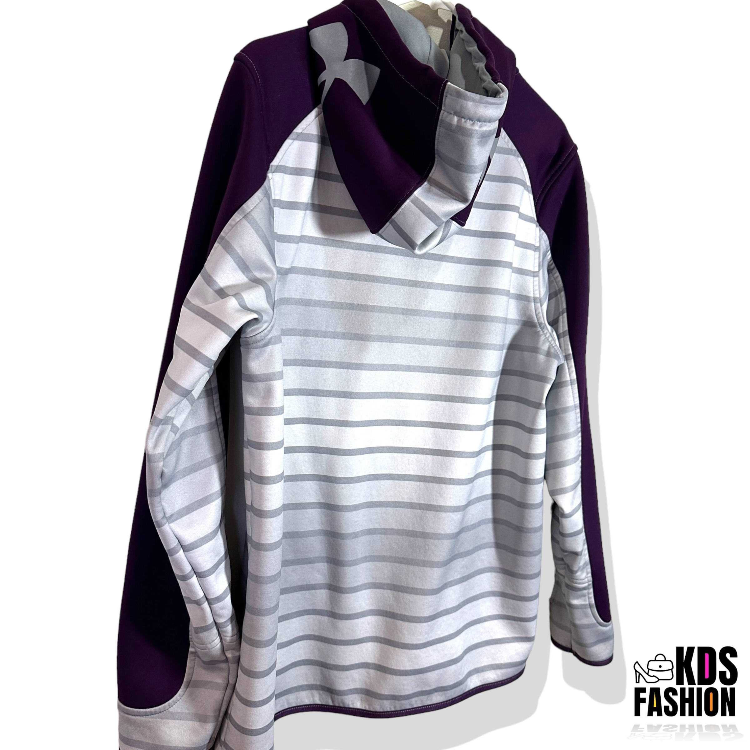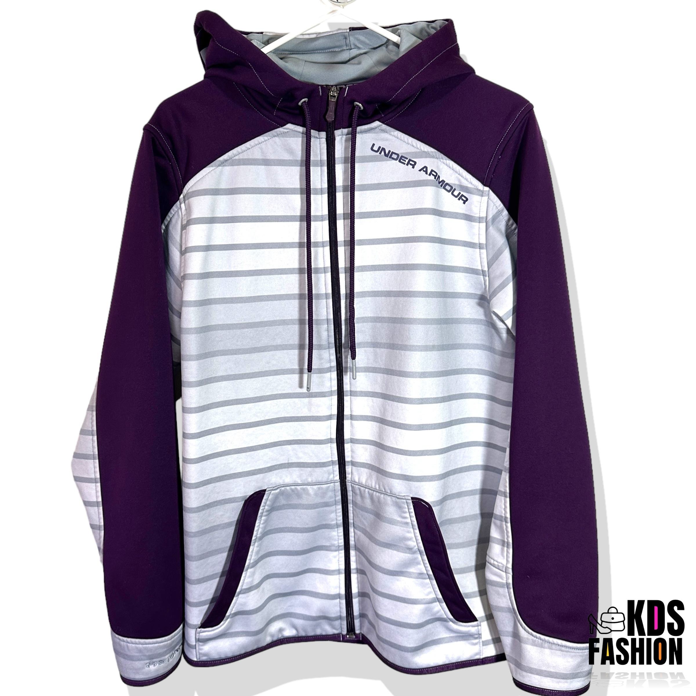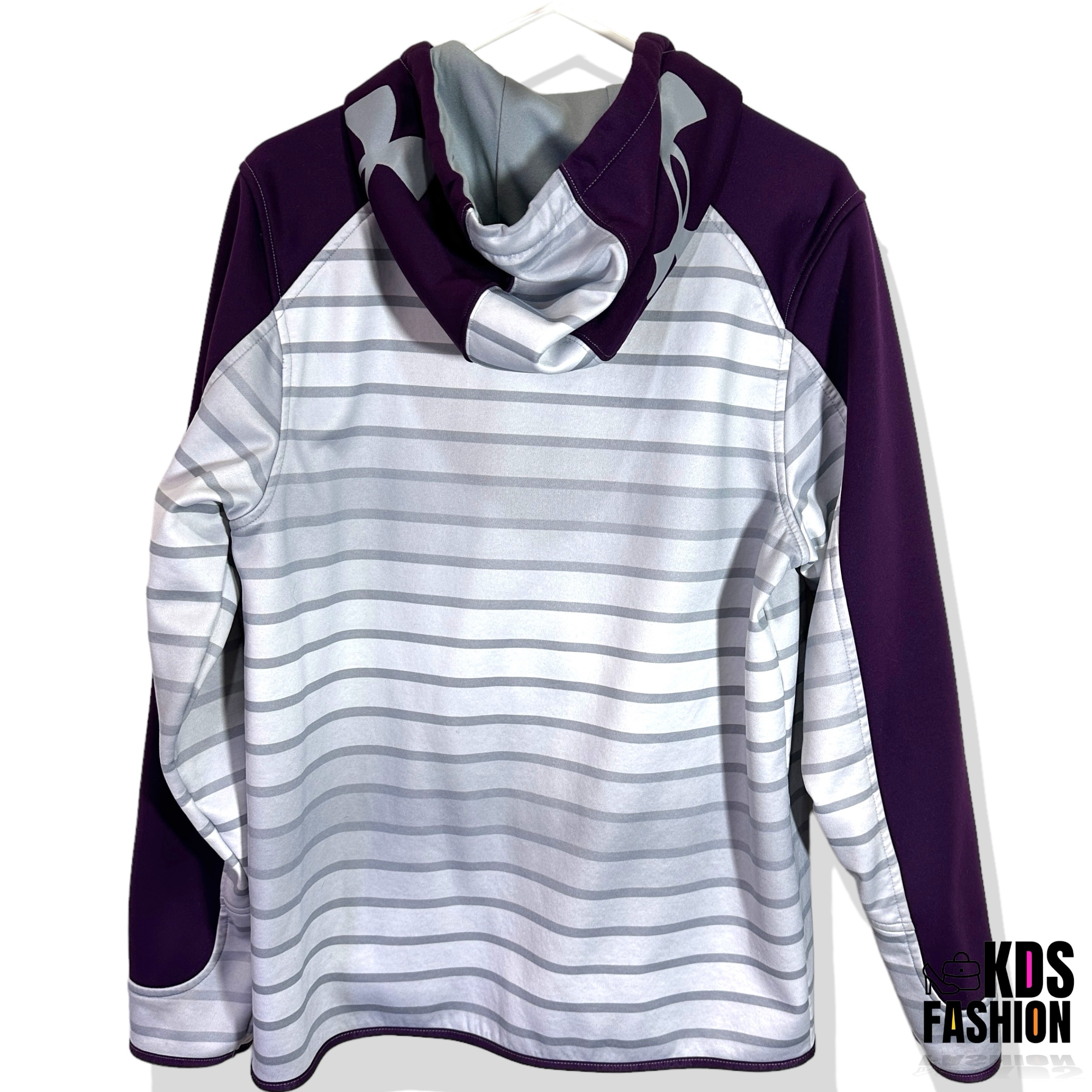 Stay warm and comfortable in this casual Under Armour Storm Men’s Fleece Full Zip Hoodie. Featuring a cool ombré color scheme in grey and eggplant purple, this hoodie is in good condition and comes with a full zip front. The UA logo on both sides of the hood adds a touch of sporty style. Sized for a men’s medium with a chest measurement of 22.5” and length of 28”. There is a small mark and slight thread pull as shown, but overall it’s a stylish and functional choice for everyday wear.