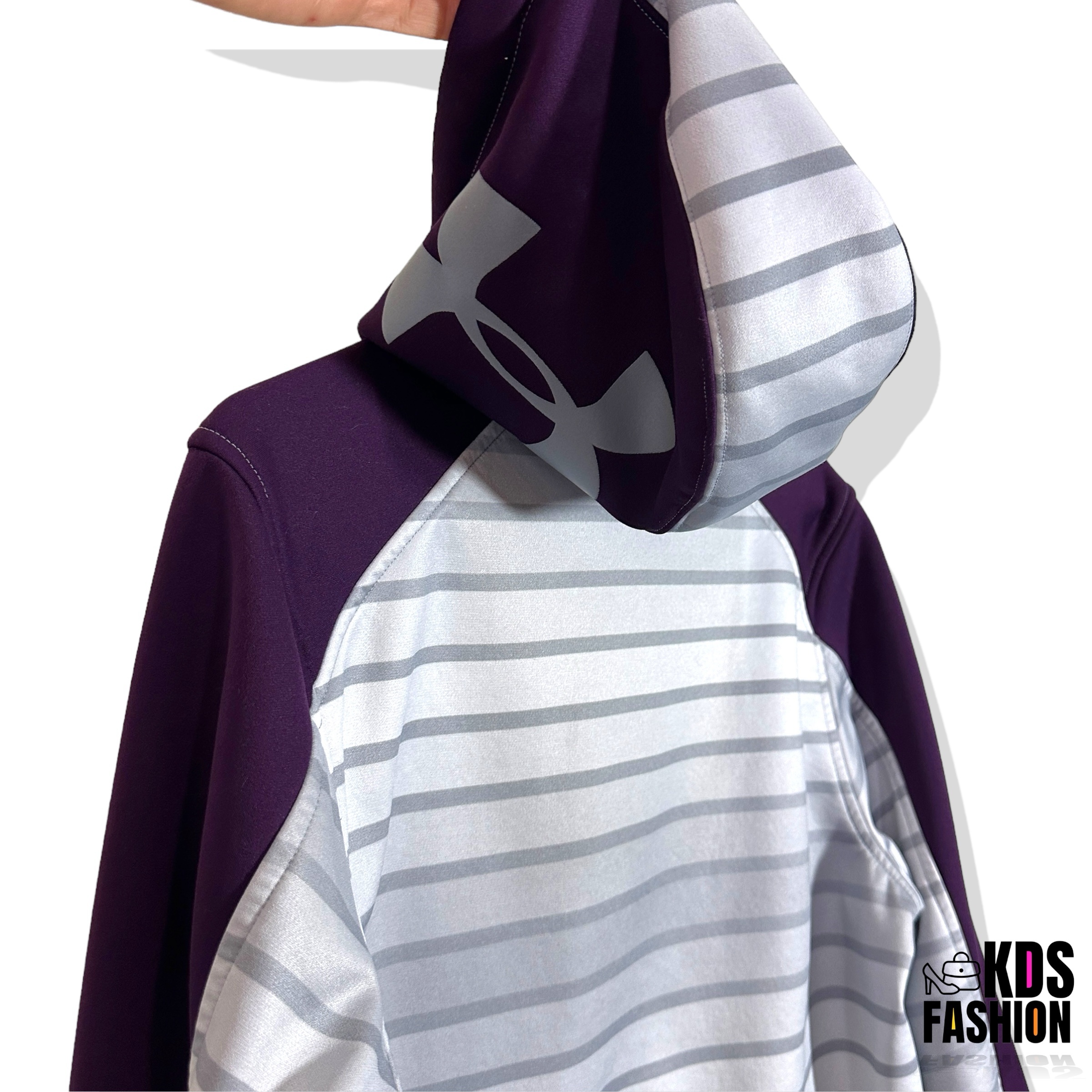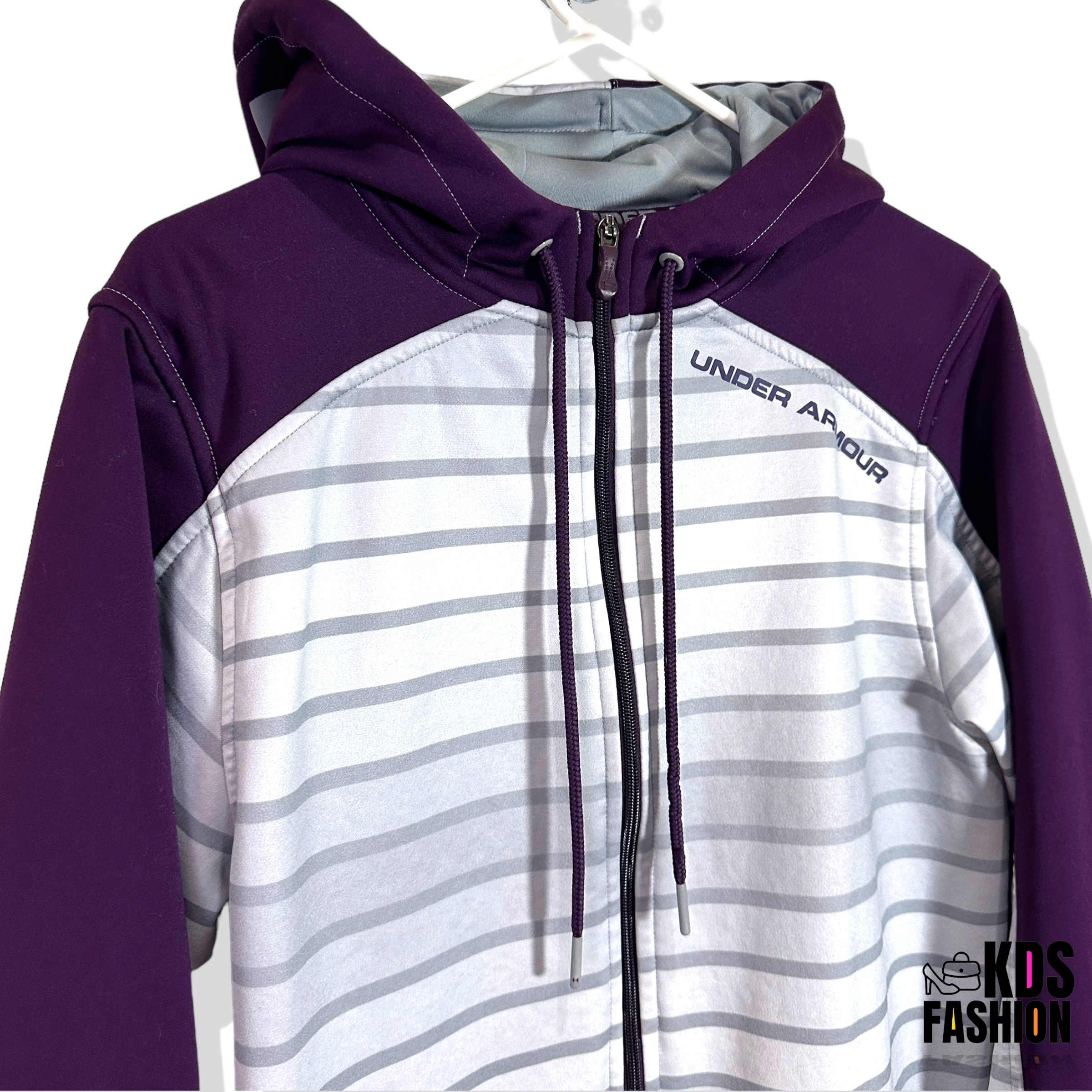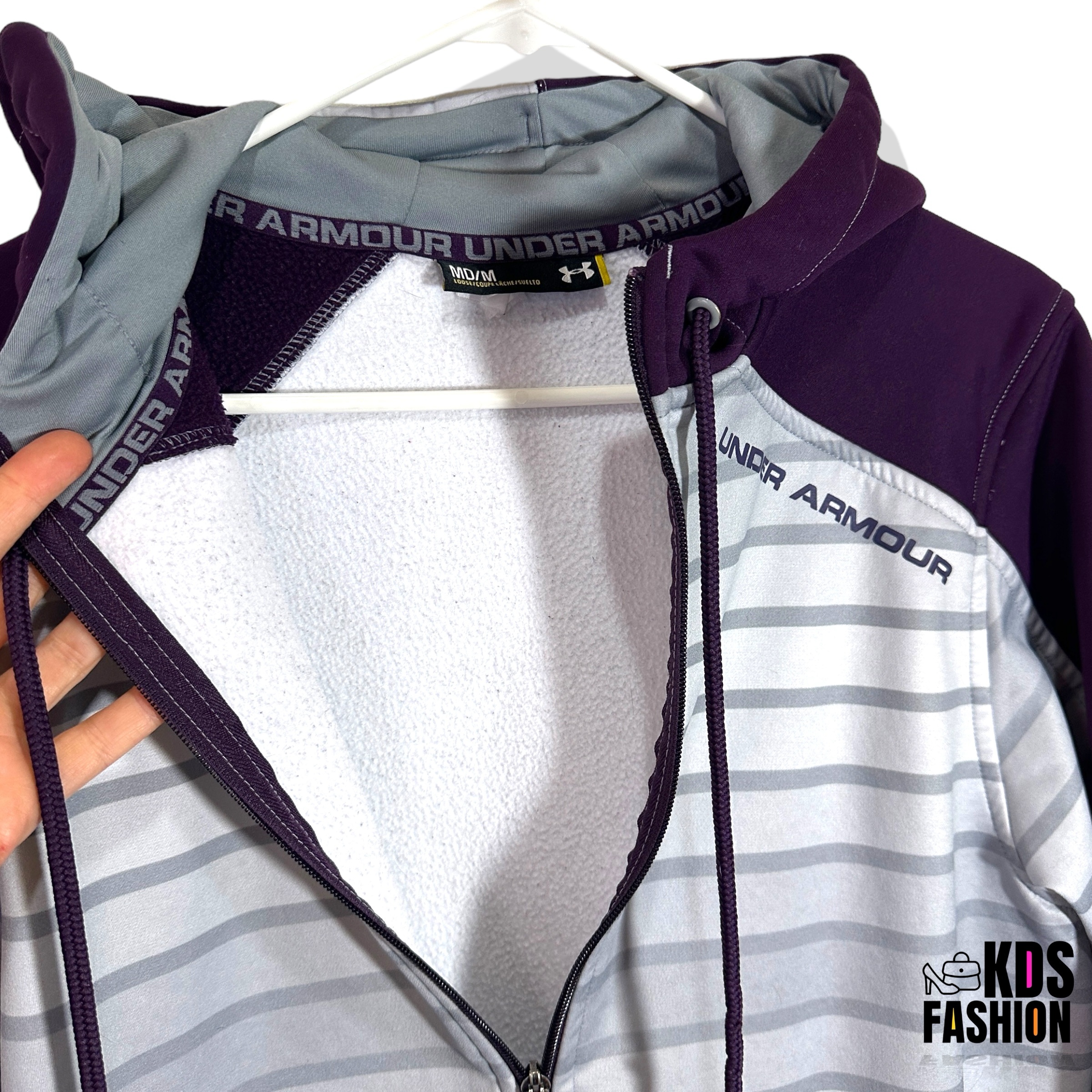 Stay warm and comfortable in this casual Under Armour Storm Men’s Fleece Full Zip Hoodie. Featuring a cool ombré color scheme in grey and eggplant purple, this hoodie is in good condition and comes with a full zip front. The UA logo on both sides of the hood adds a touch of sporty style. Sized for a men’s medium with a chest measurement of 22.5” and length of 28”. There is a small mark and slight thread pull as shown, but overall it’s a stylish and functional choice for everyday wear.