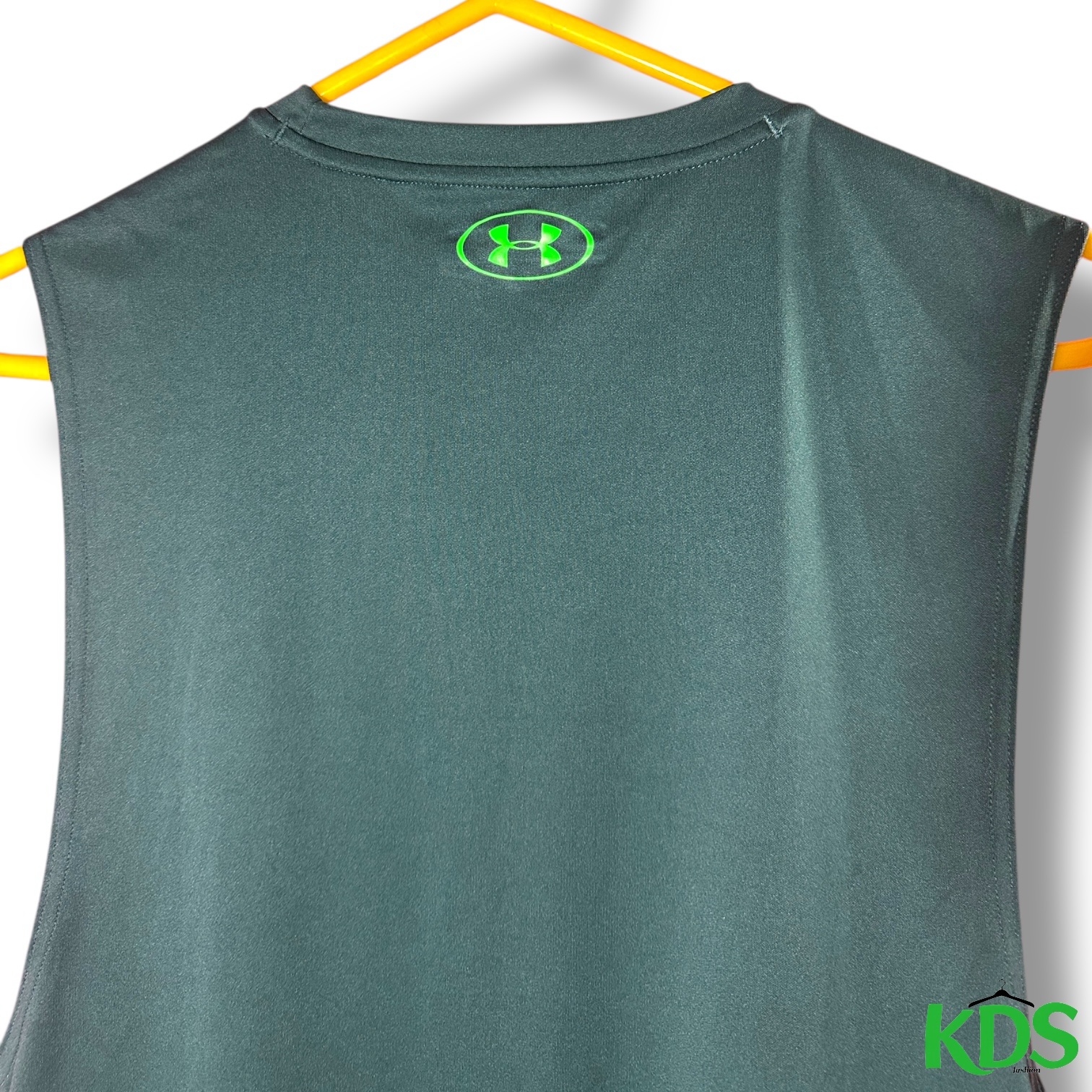 This Under Armour tank top showcases a striking dark green hue with a contrasting neon green logo, perfect for those outdoor practices. Crafted from performance material, it features a sleeveless design and a classic crew neckline for optimal comfort and style.