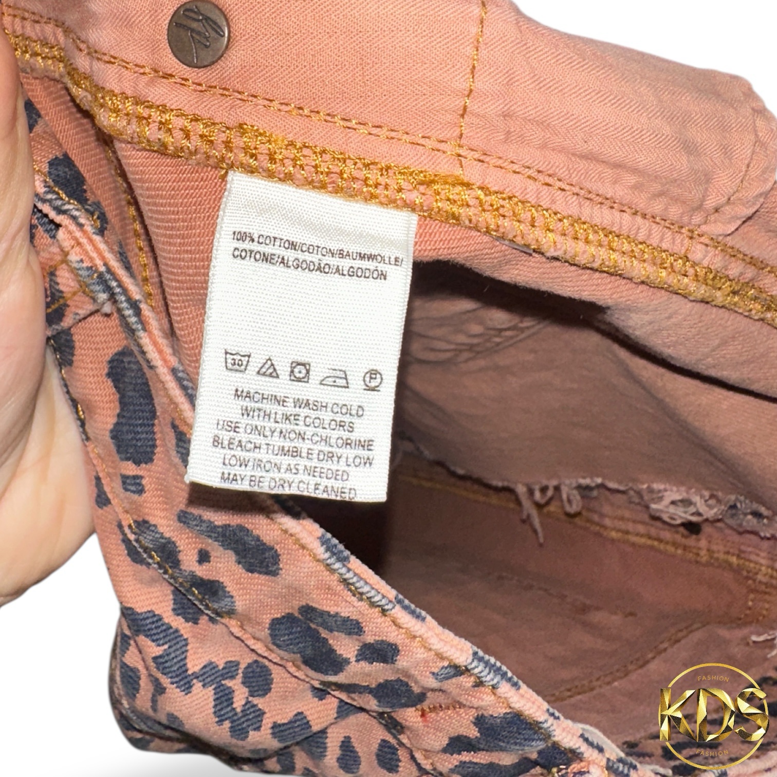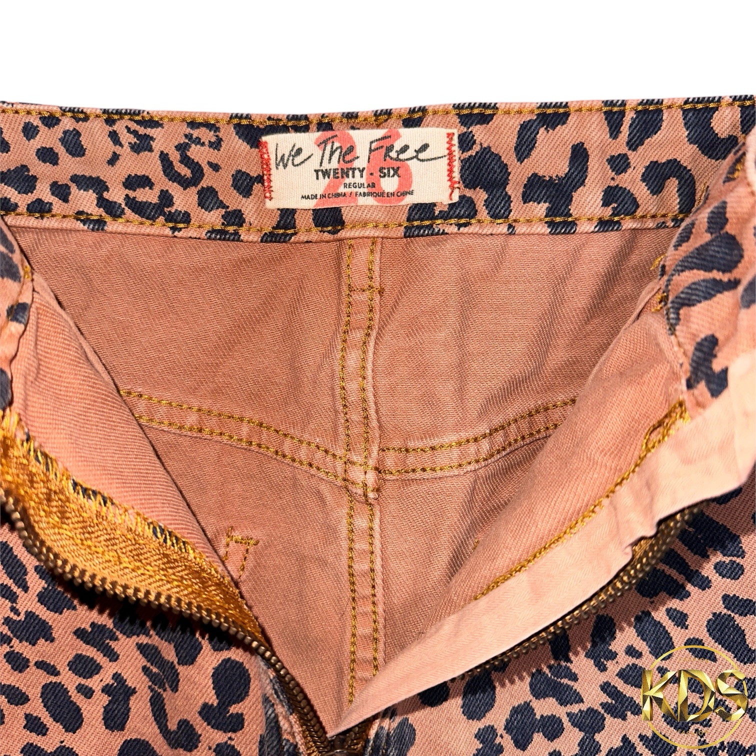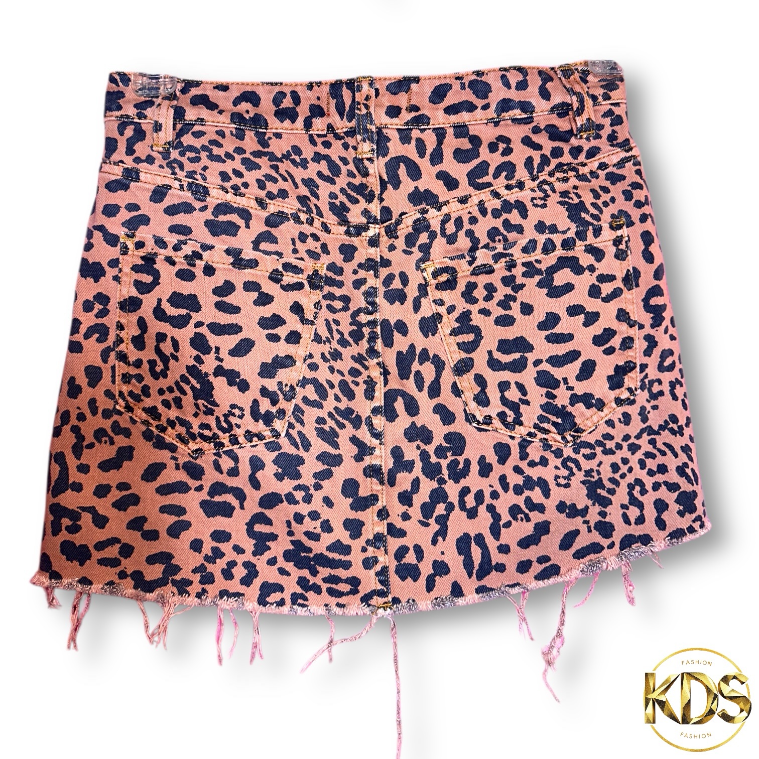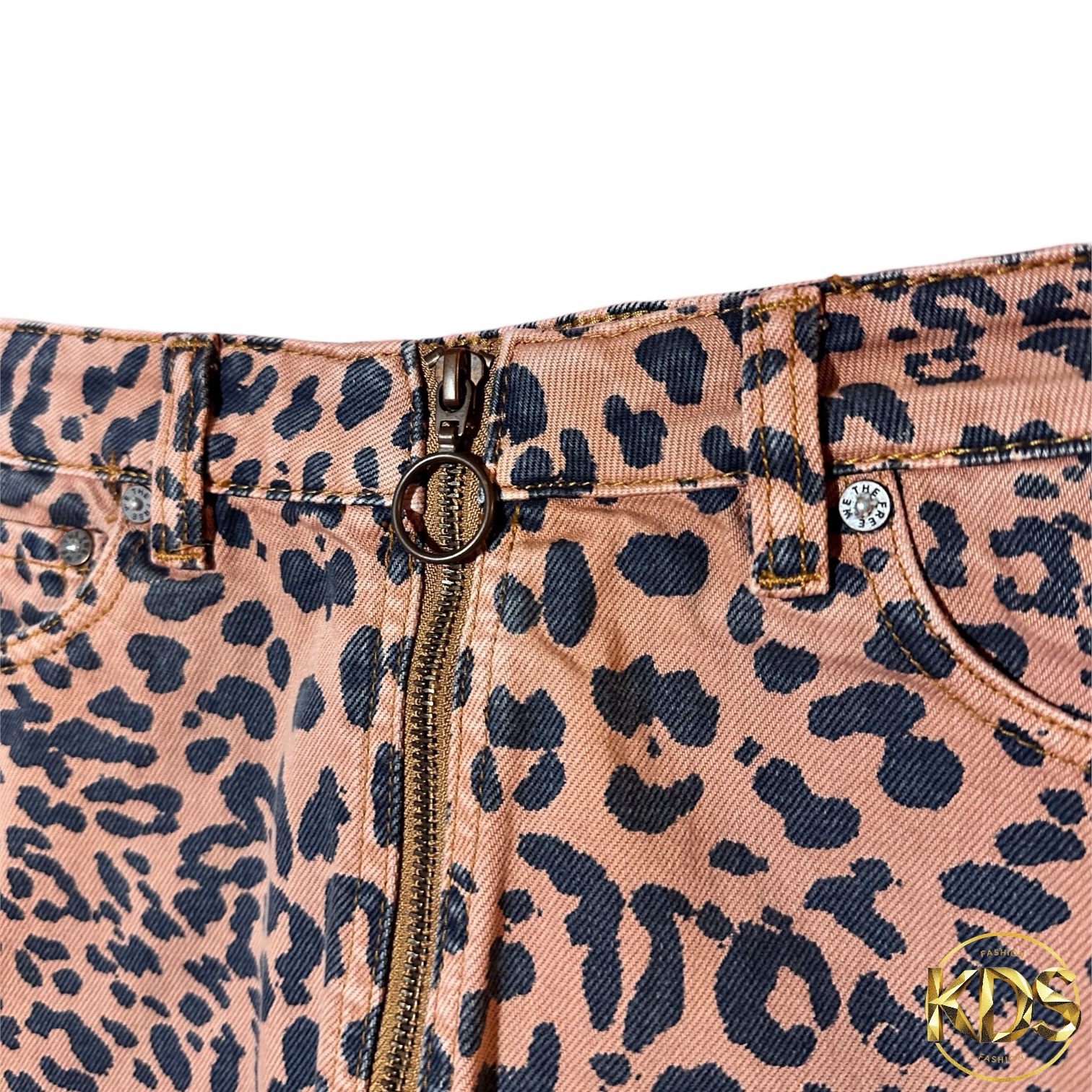 Fun, edgy leopard print mini skirt by We The Free (Free People). Features a front zipper closure, raw/frayed hem, and a flattering structured denim feel. Perfect festival, casual, or night-out piece.