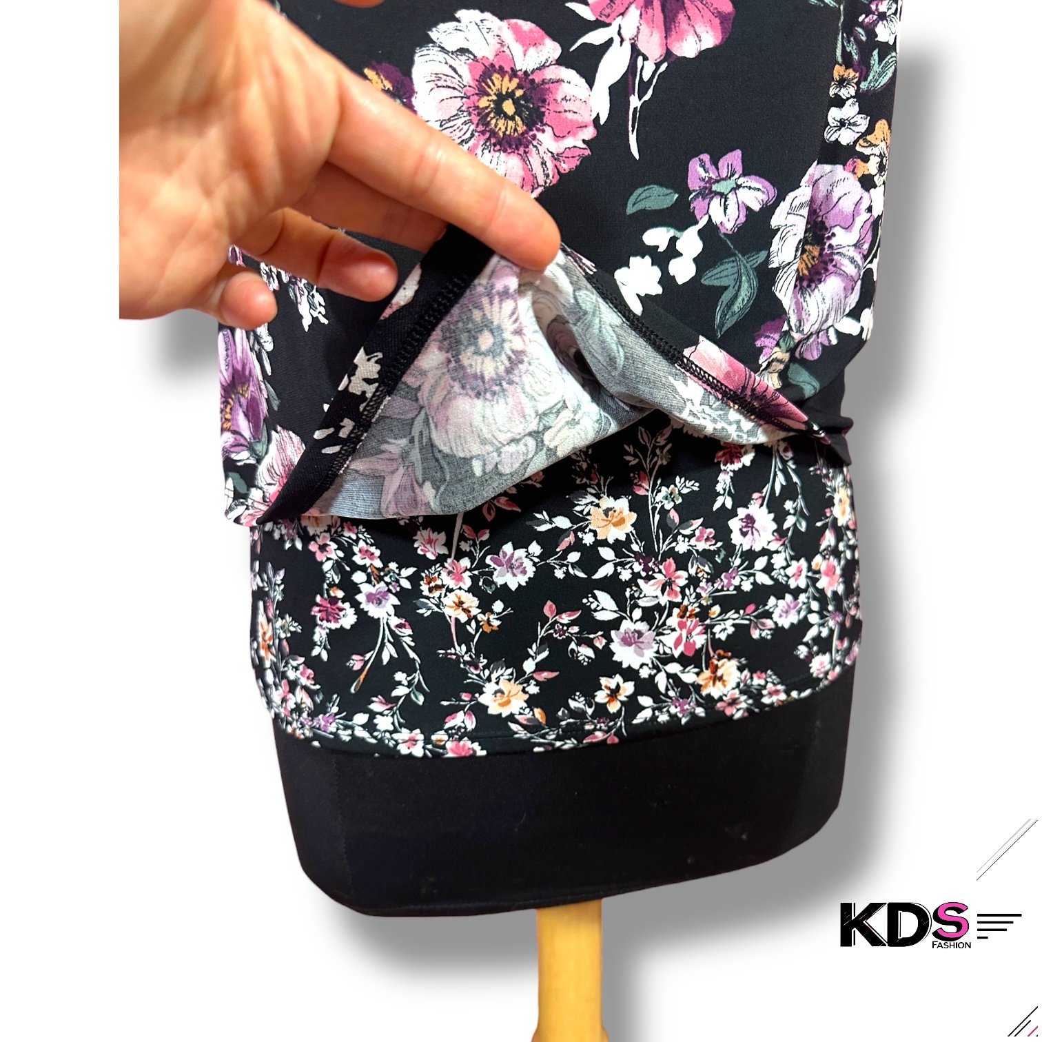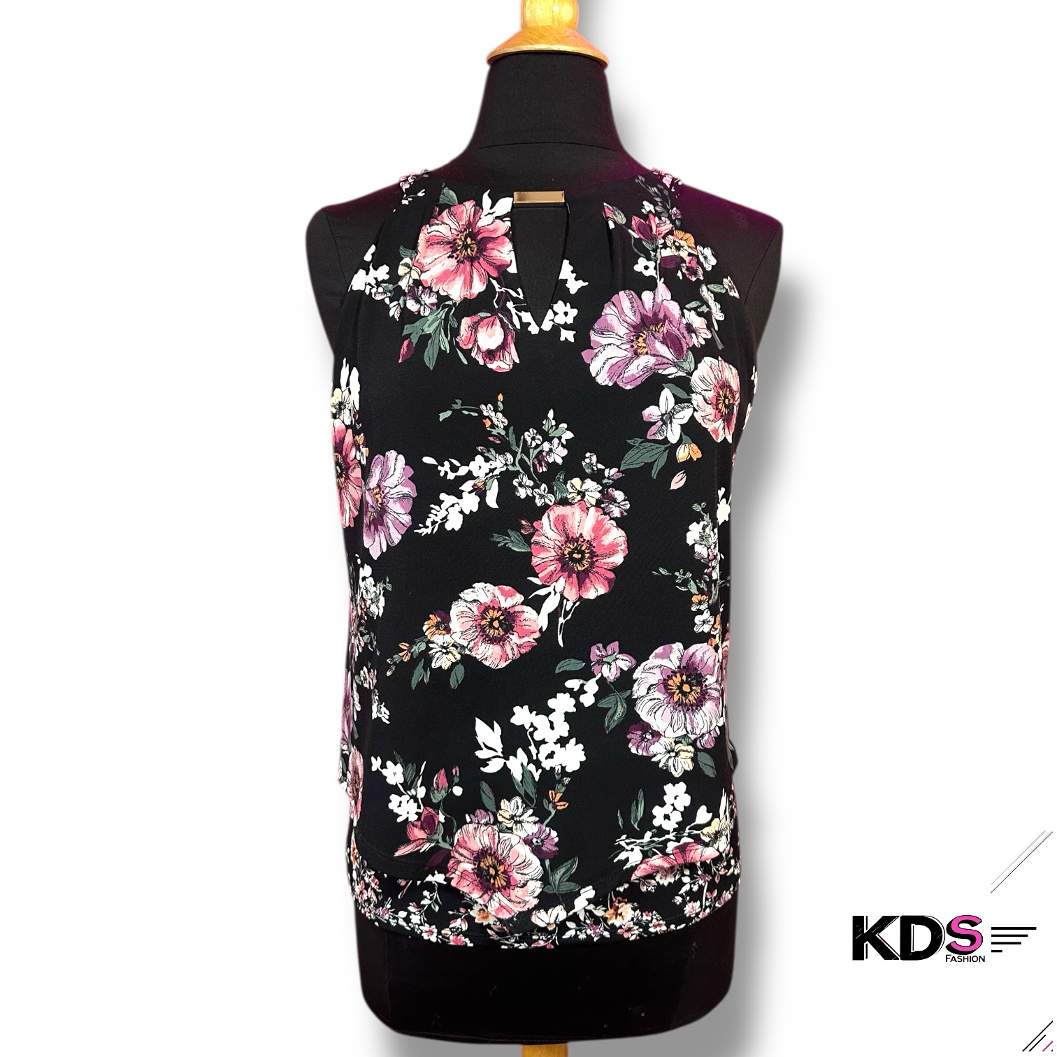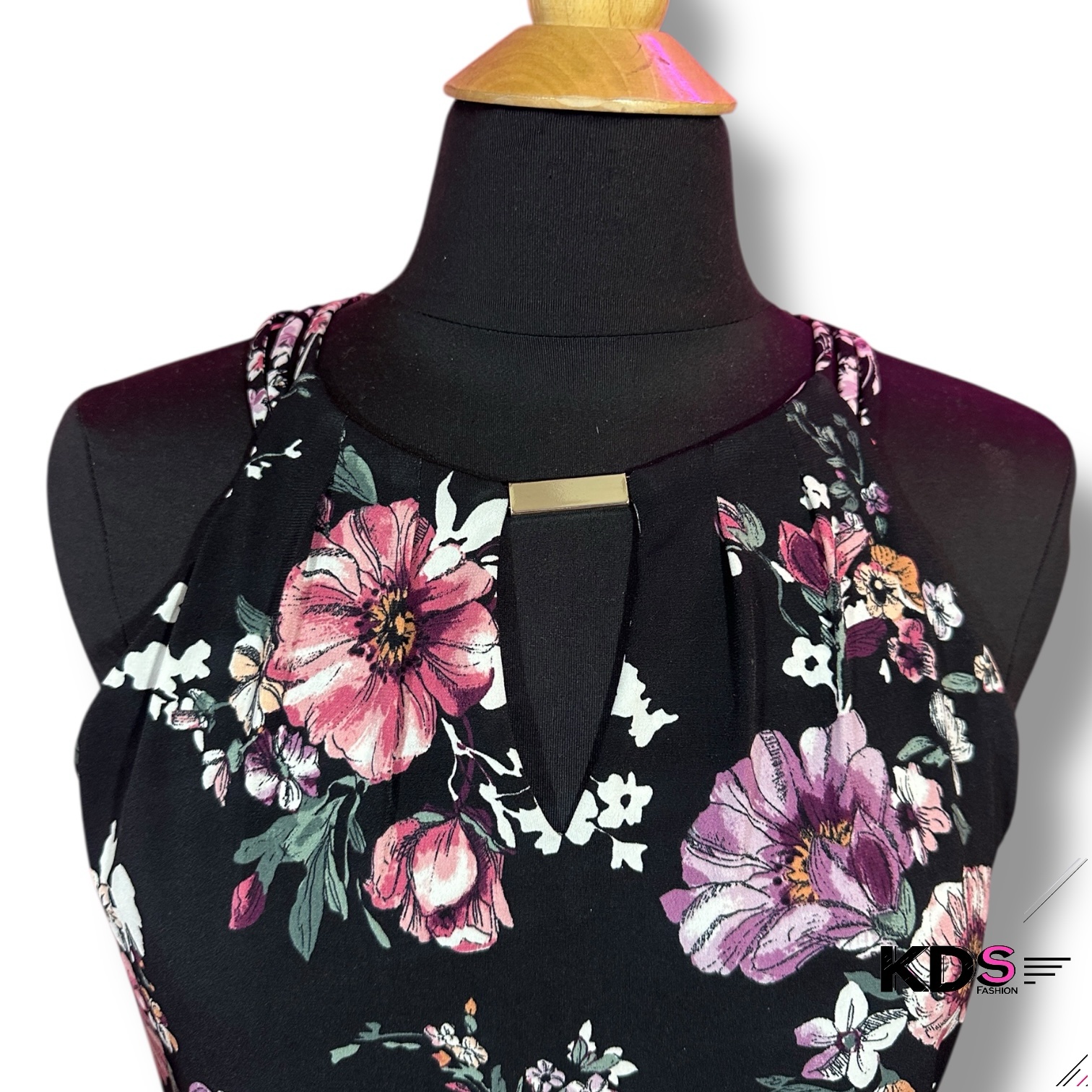 This chic floral halter neck top features a stunning v-cut overlay with vibrant floral layer underneath to accent it. Key holes in the front and back with silver hardware/buttons.