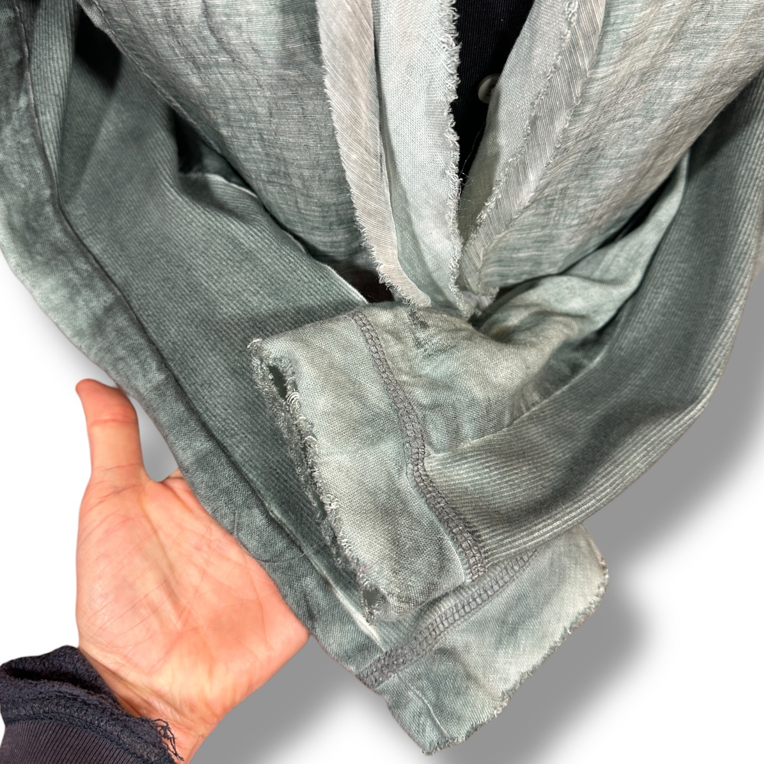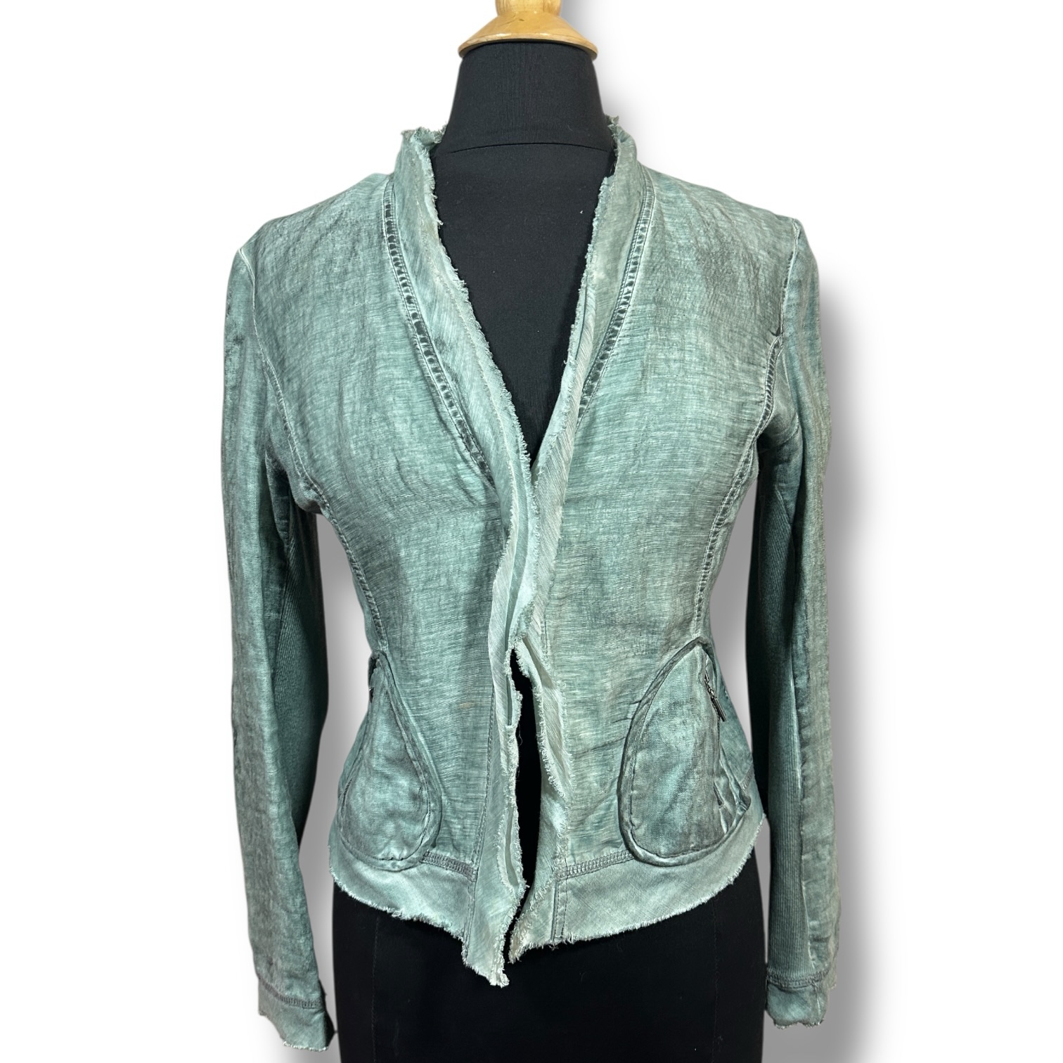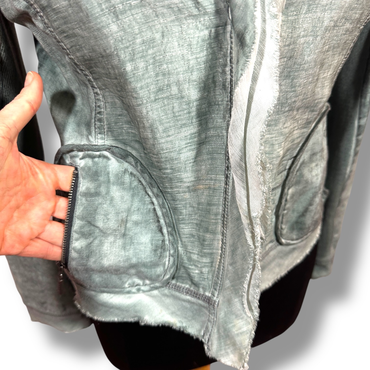 This Yest 100% linen jacket features a soft sage green tone with intentional raw edge trim and curved zip pockets for a relaxed yet structured silhouette. Lightweight and versatile — perfect for spring layering, summer evenings, or early fall transitions.